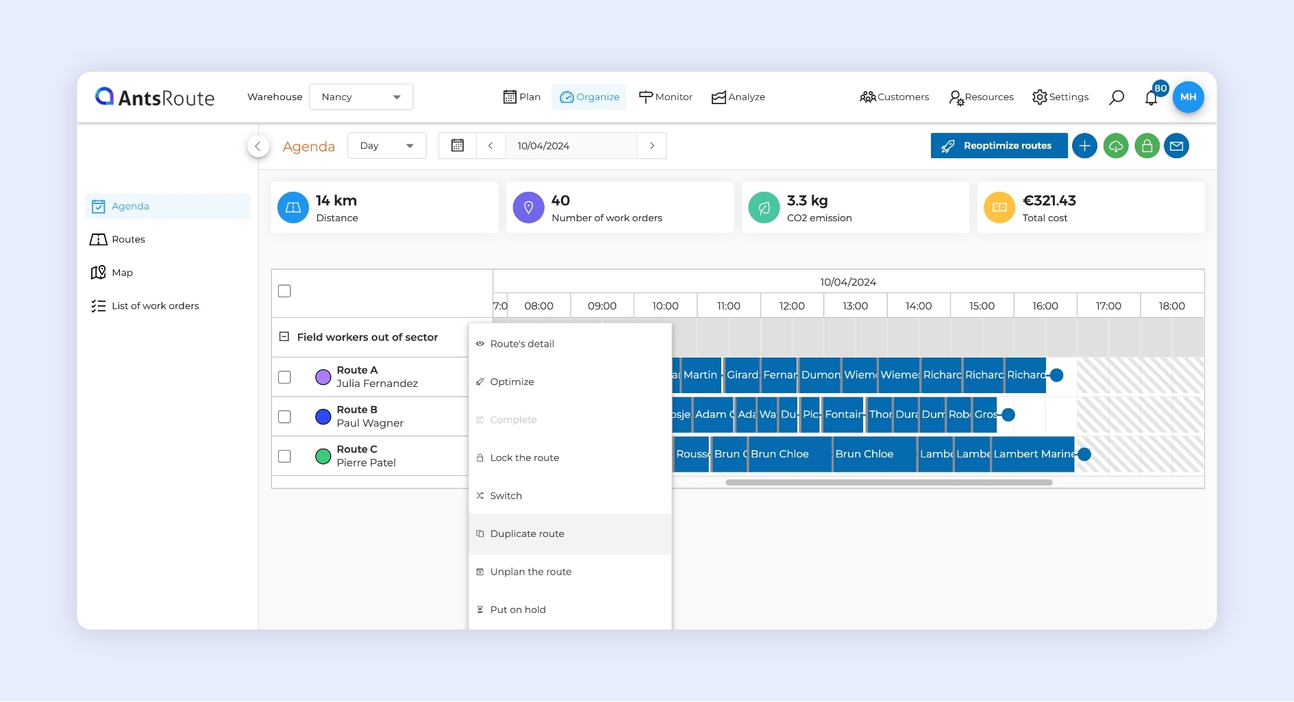 Start by going to the “Routes” tab of the “Organise” module. Identify a named route and click on “…” > “Duplicate the route”. Select a period and the days of application. You can also duplicate ongoing and completed routes.