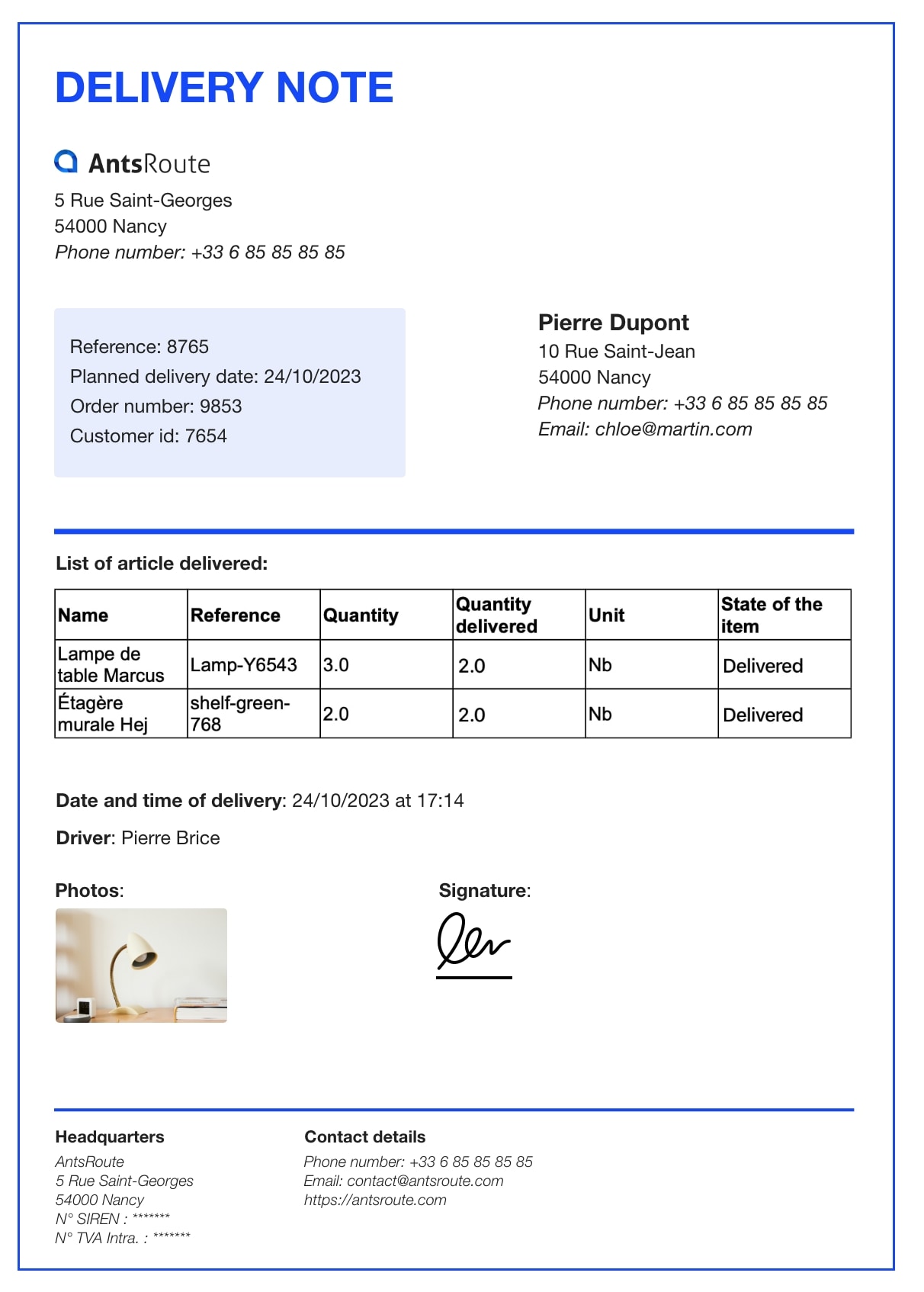 During deliveries, drivers can determine whether items have been delivered in conformity, delivered with anomalies or not delivered. If the option is activated, they can indicate the quantities of items actually delivered. The function also allows you to ask your drivers to fill in additional fields depending on the status of the item previously selected.
