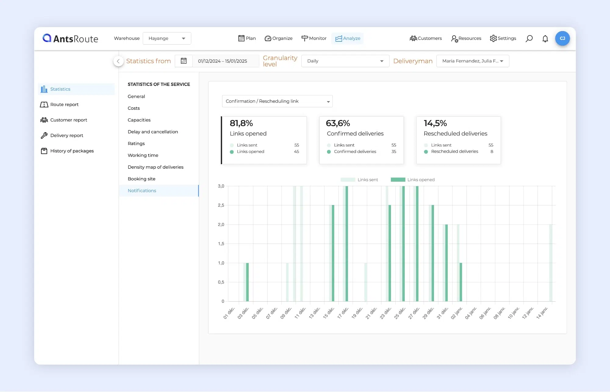 The statistics on the notifications sent to customers on AntsRoute.