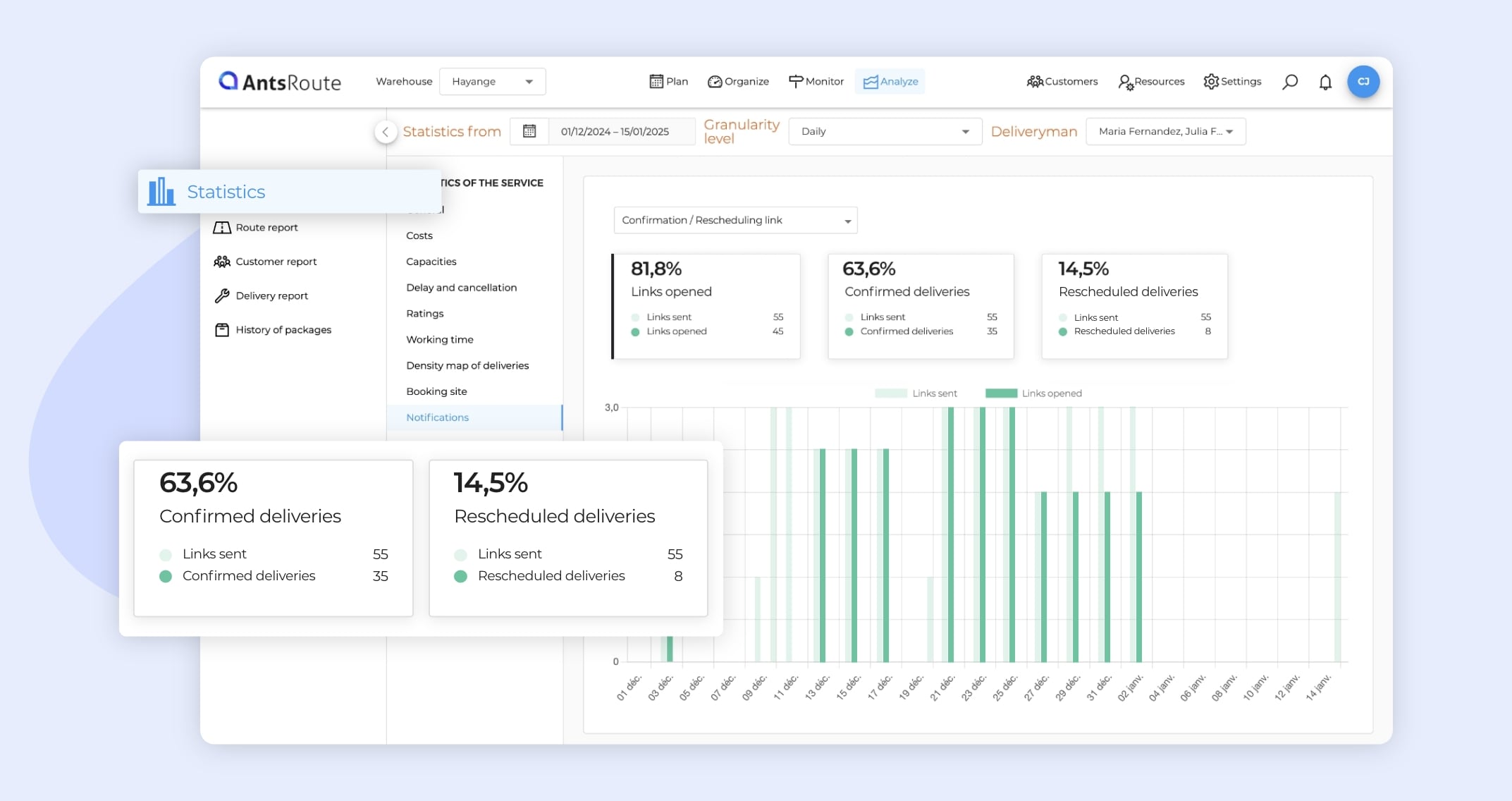 The statistics on the notifications sent to customers on AntsRoute.