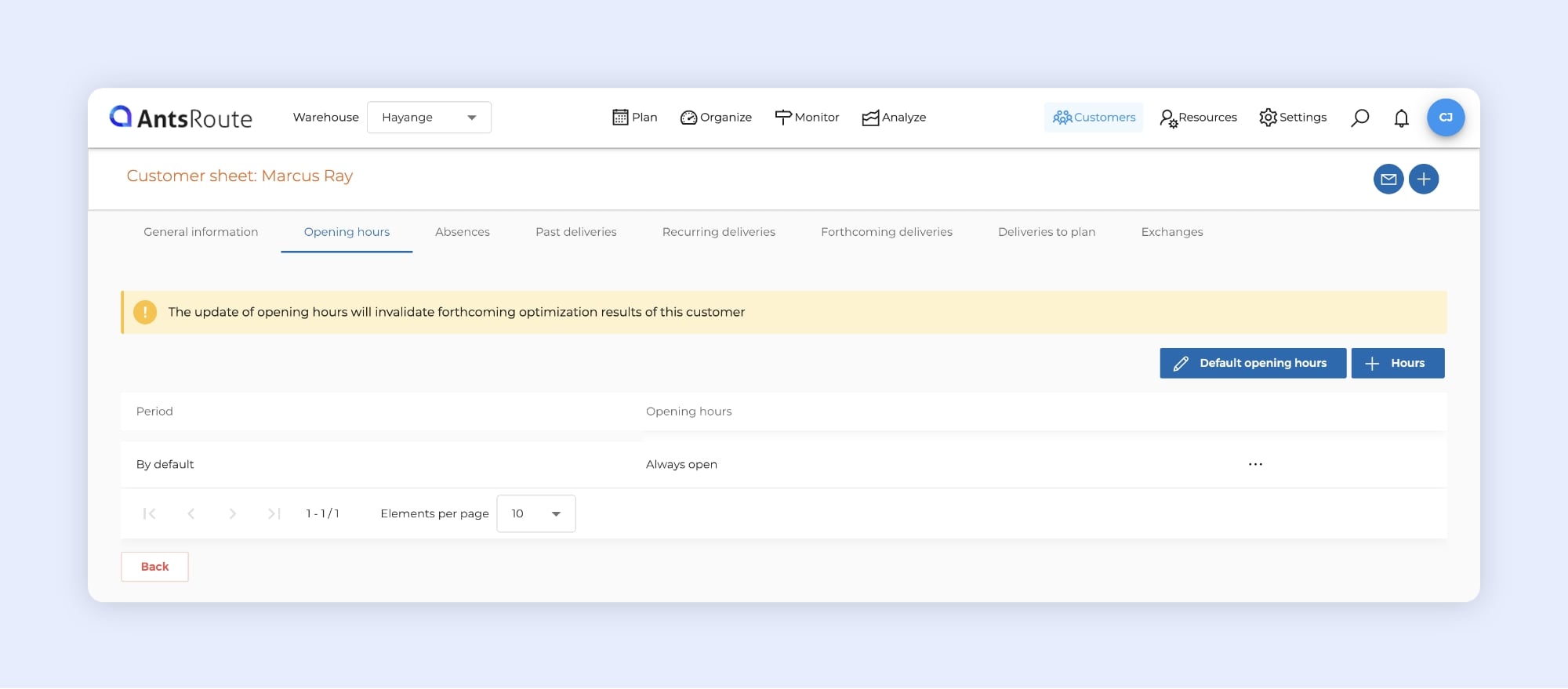 Following your feedback, a blue “Default opening hours” button is now available above a customer’s opening-hours table. No need to use the “…” menu on the first row anymore: the change is more visible and much faster.