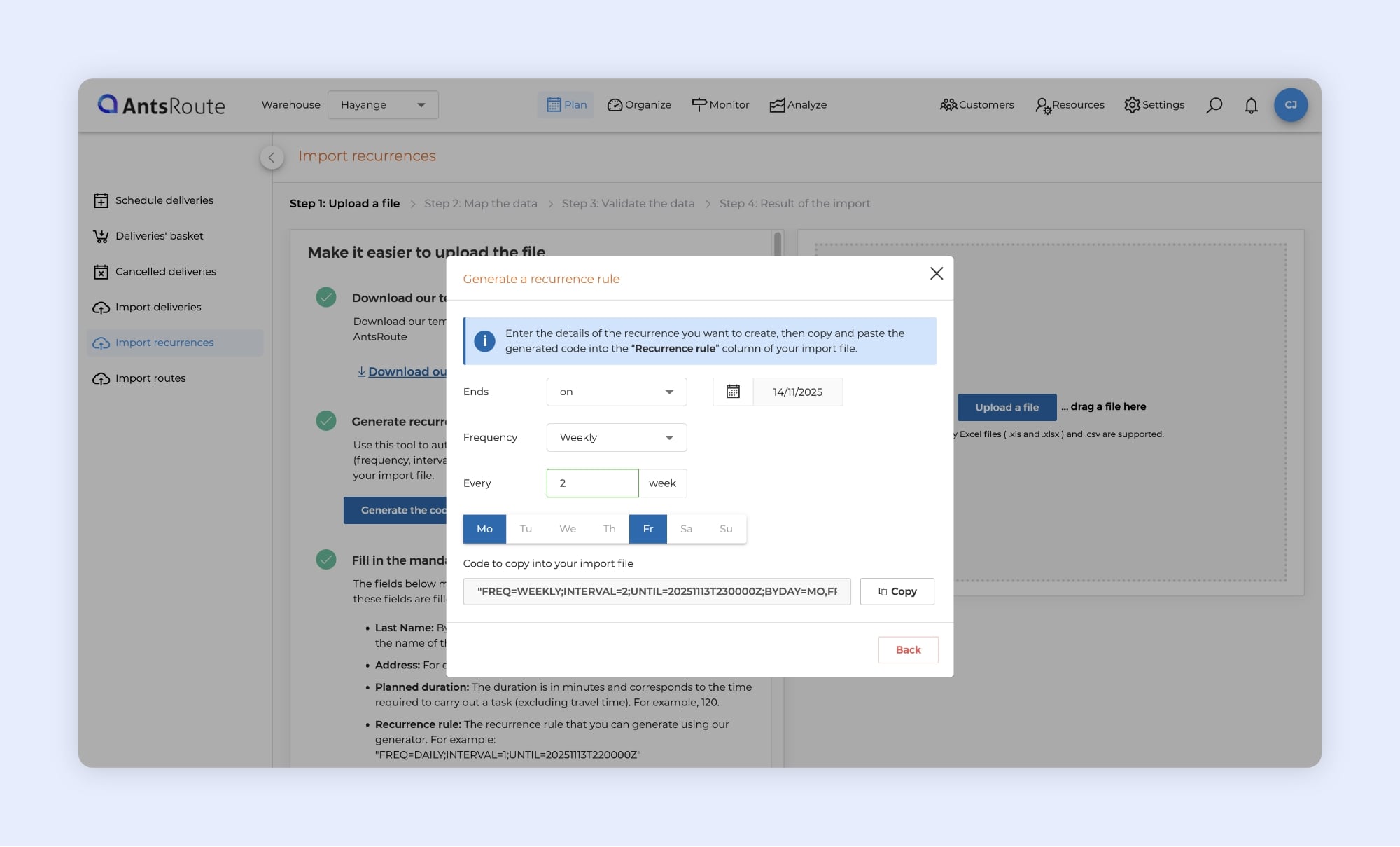 Do you manage repeated jobs (daily, weekly, monthly, etc.)? AntsRoute now lets you create them in bulk by importing an Excel or CSV file. For planning teams, this update puts an end to time-consuming manual entry: structure your file, generate the recurrence rule, import, and you’re good to go.