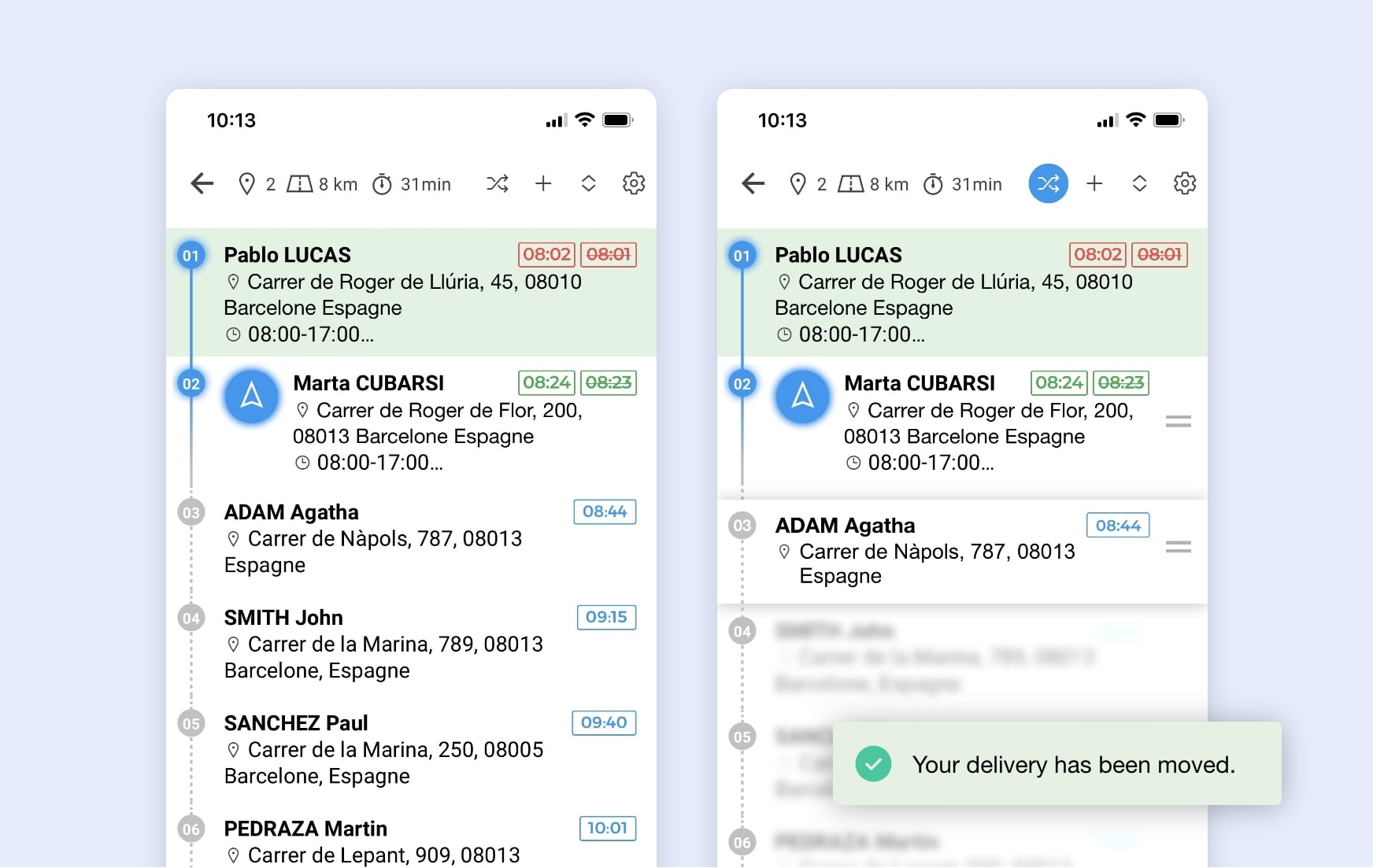 The feature introduced in August is evolving: your drivers can now change the order of stops directly from the mobile app, even when the route has already started. This is ideal for handling an unexpected event without going back through the back office.