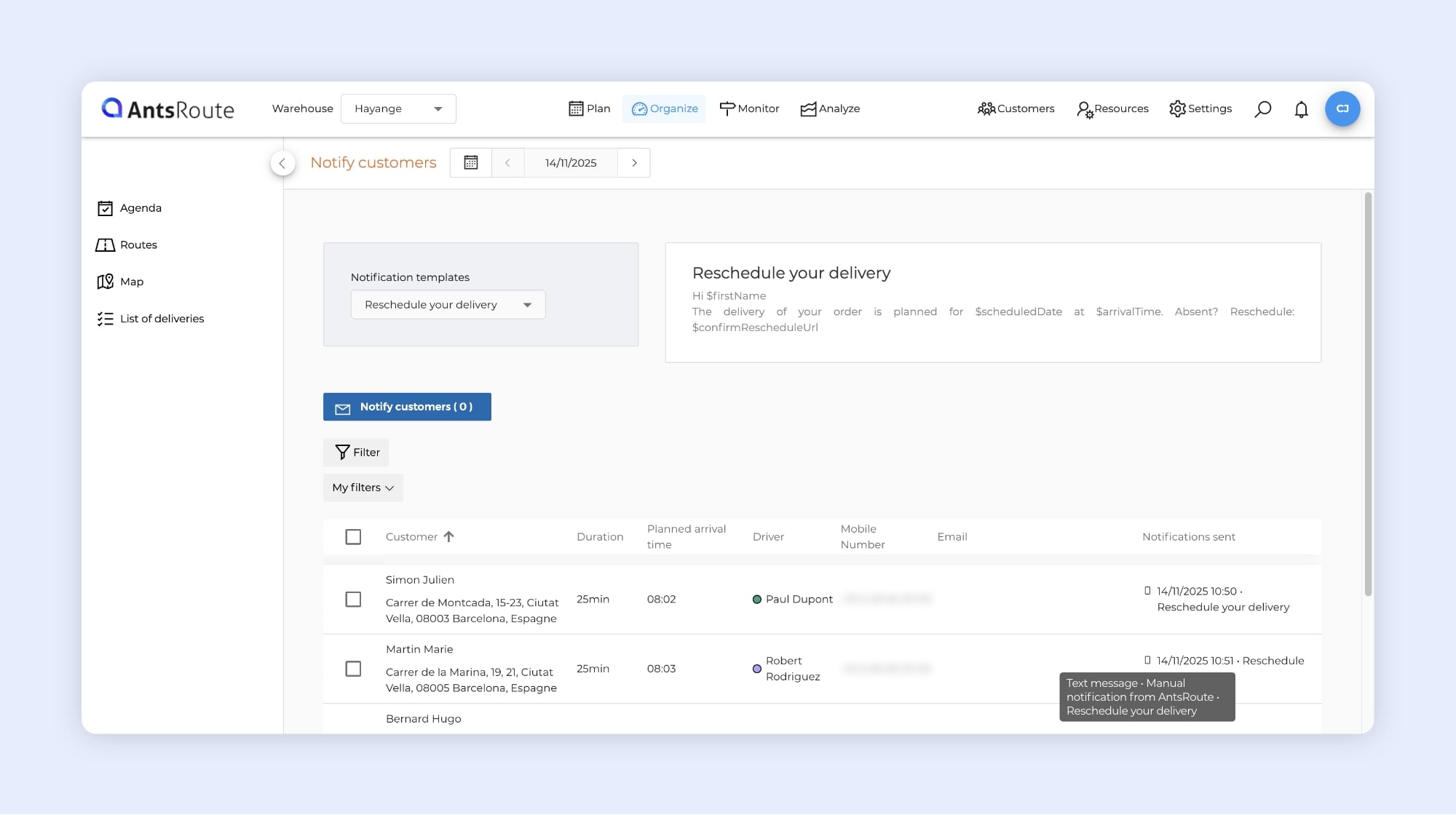 Sending bulk notifications from AntsRoute? Good news: the customer selection table now offers better traceability. In the “Notifications sent” column, you’ll now see, not just the date and time, but three key details: the type, the trigger, and the name of the template used.