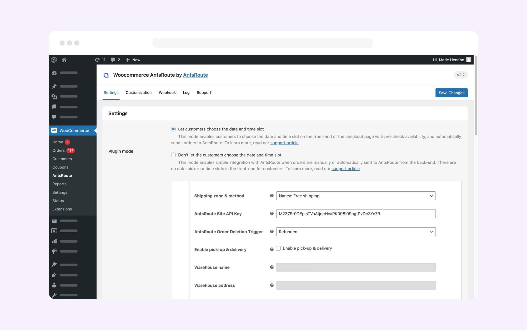 Step 5: Go to your WordPress account to set up the “WooCommerce Local Delivery Date Picker & Time Slots by AntsRoute” plugin. In the WooCommerce plugin, you can now access the “AntsRoute” tab. From this page, you can choose one of the two working methods mentioned above.