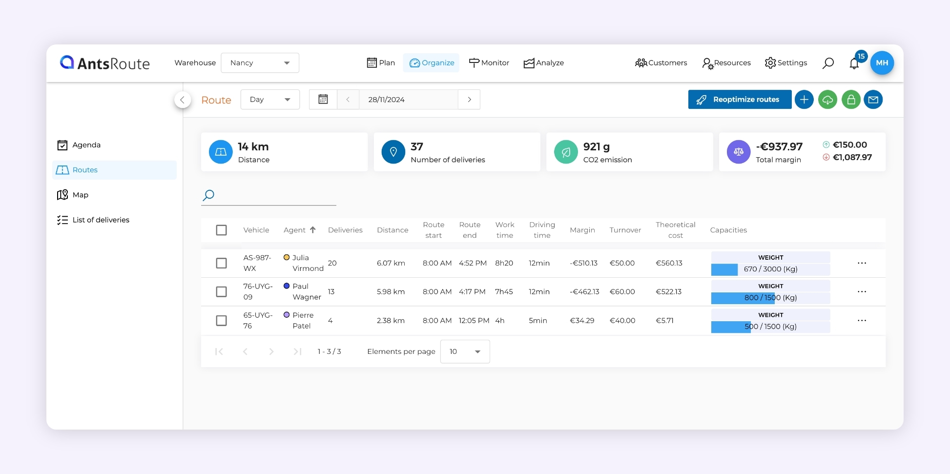 - Grouping orders to maximise the use of trucks: AntsRoute automatically groups orders whenever possible, based on their location and specific constraints (time slots required by customers, delivery time, type of goods). This allows trucks to be loaded to full capacity, limiting half-empty journeys and increasing the profitability per route.
