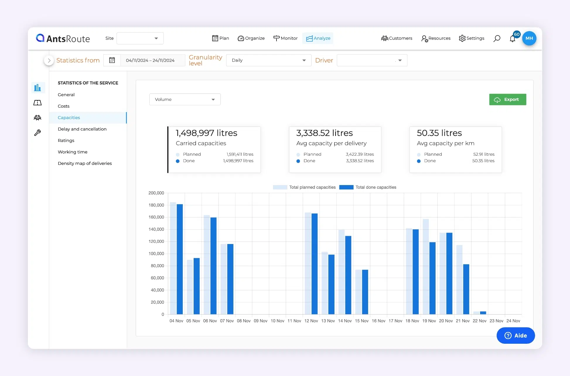 - Identification of under-used trucks: The detailed reports provide an overview of how trucks are being used. This makes it possible to quickly identify vehicles that are running half-empty or whose capacity is being poorly exploited. This analysis helps to optimise future routes by redistributing loads or adjusting the size of the vehicles used.