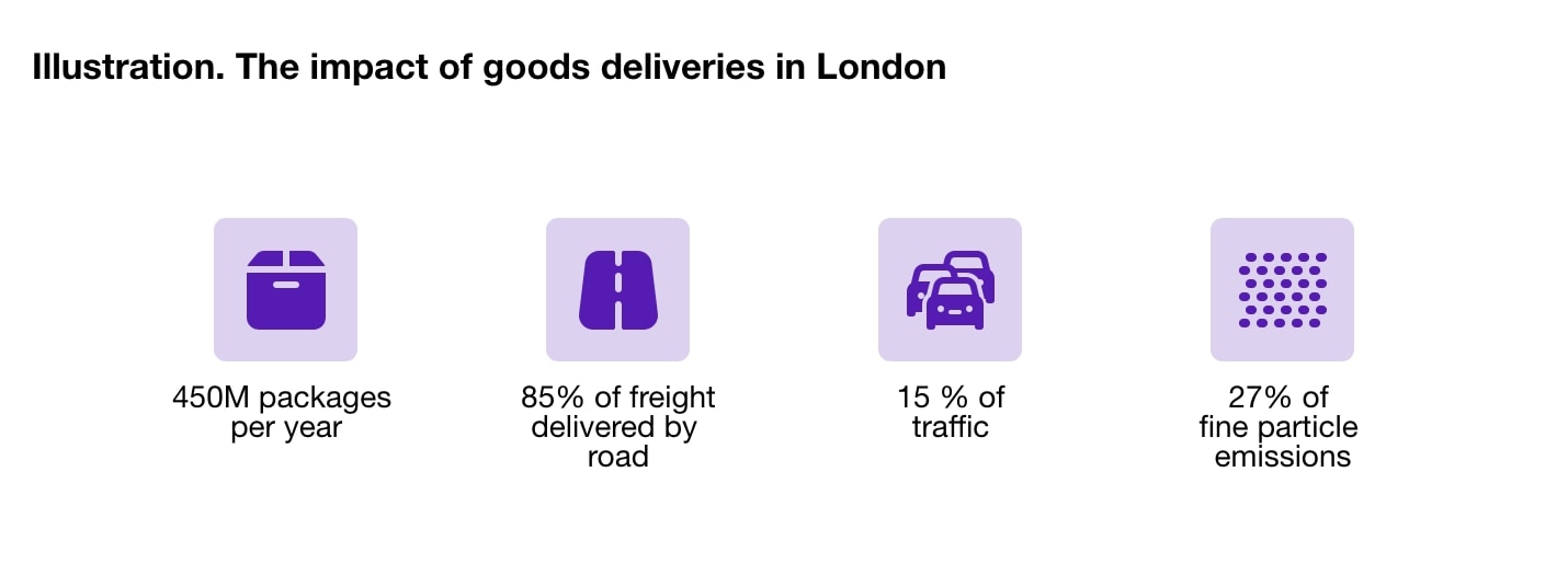 The Centre for London estimates that 450 million packages are delivered in London every year, i.e. 1 package a week for every inhabitant. Yet 85% of freight in the UK is delivered by road, generating massive pollution.