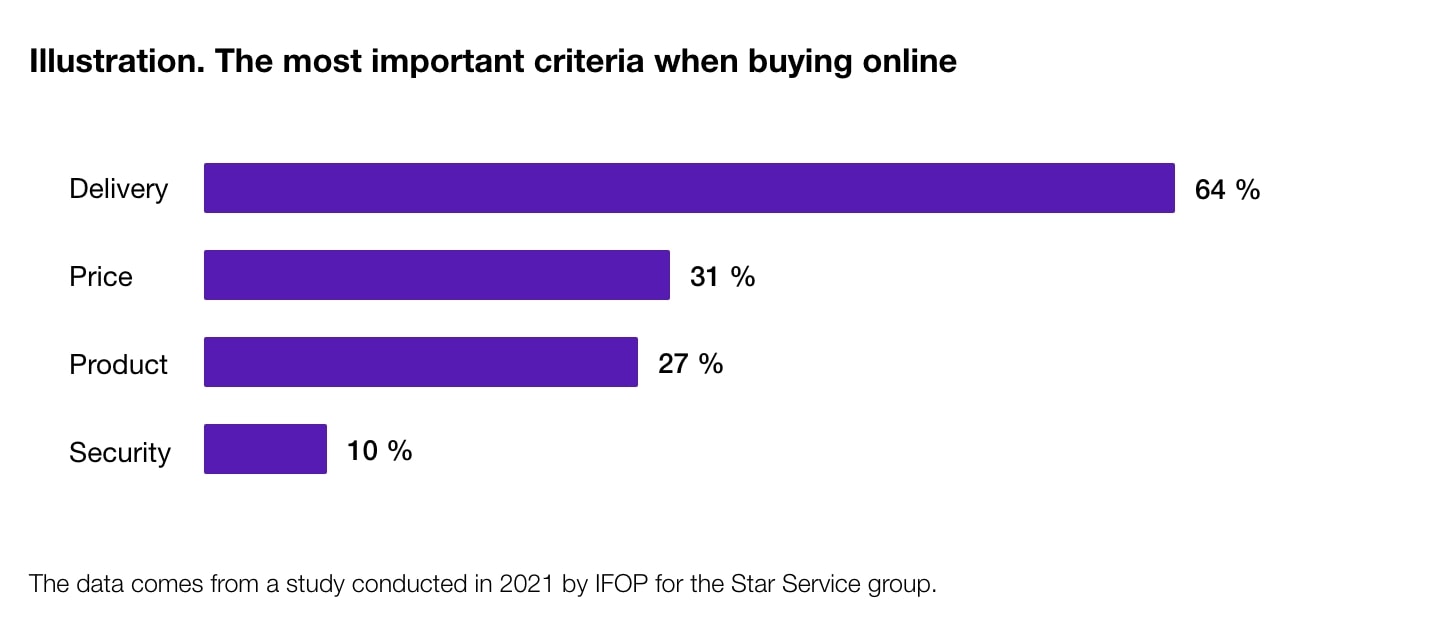 According to a study conducted in 2021 by IFOP, an international polling and market research firm, delivery remains the most important factor when buying online for 64% of customers, far ahead of price (31%) and the product itself (27%).