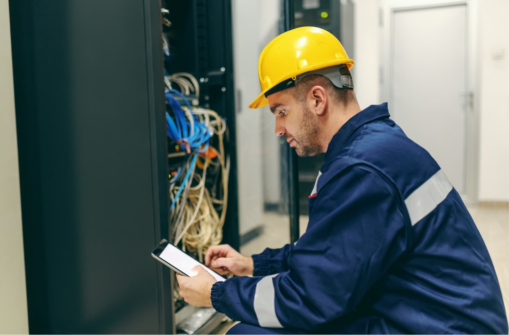 A technician with a tablet working on an industrial machine.