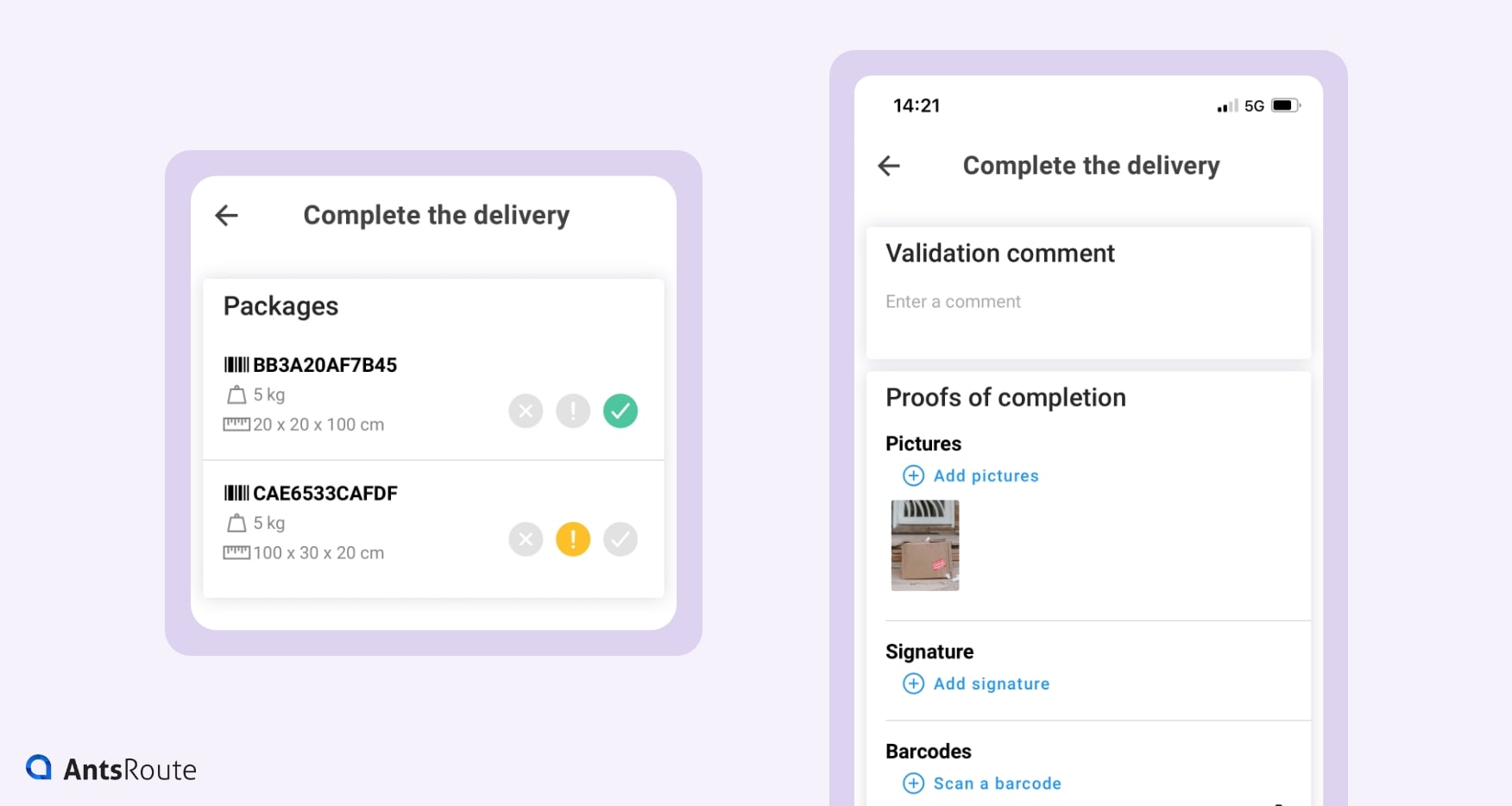 Drivers validate their deliveries directly from the AntsRoute mobile application (iOS and Android).