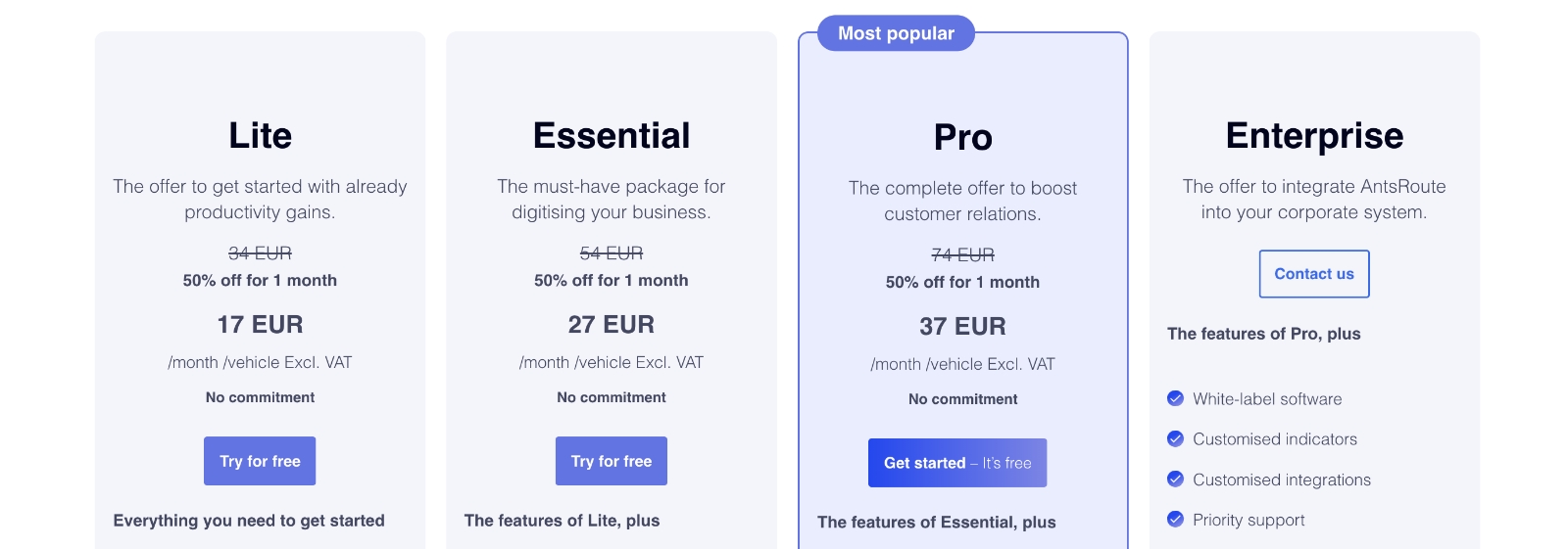 - Low initial cost (monthly or annual subscription, from €34/month per vehicle at AntsRoute).