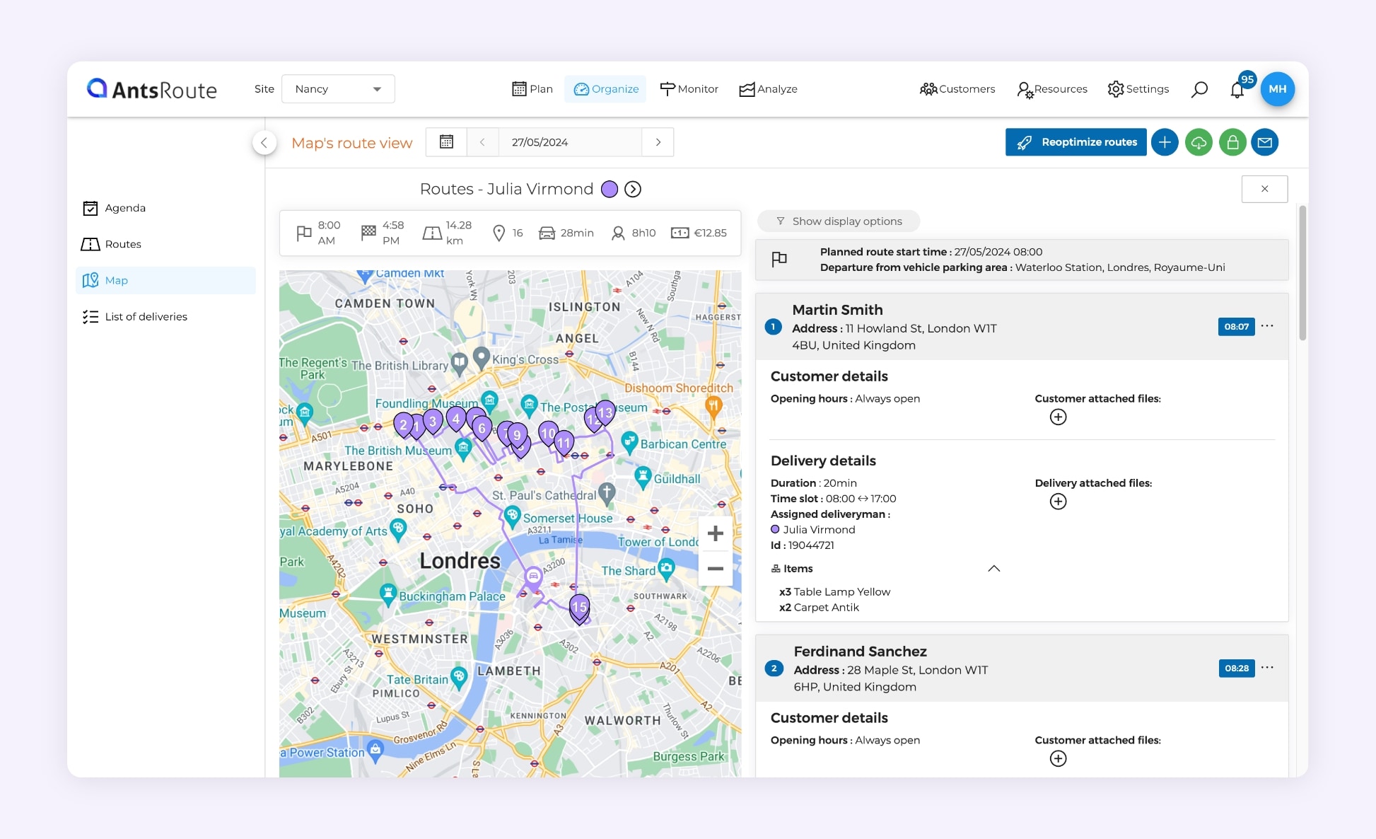 The AntsRoute route optimisation software interface.