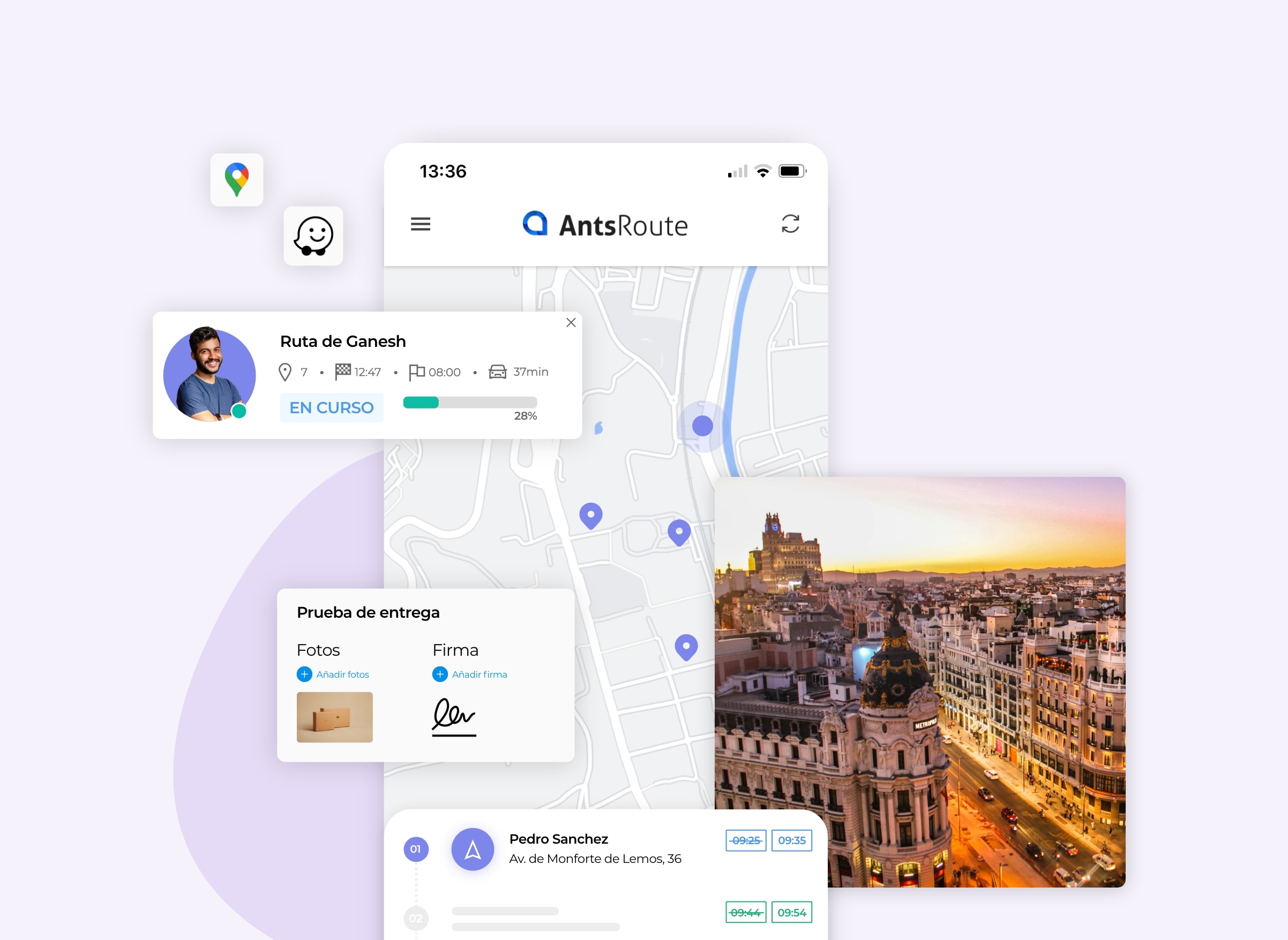 AntsRoute integra automáticamente tu software de navegación preferido, Waze o Google Maps. Una solución 2 en 1 ideal para gestionar de manera óptima los imprevistos que surgen en tus rutas: