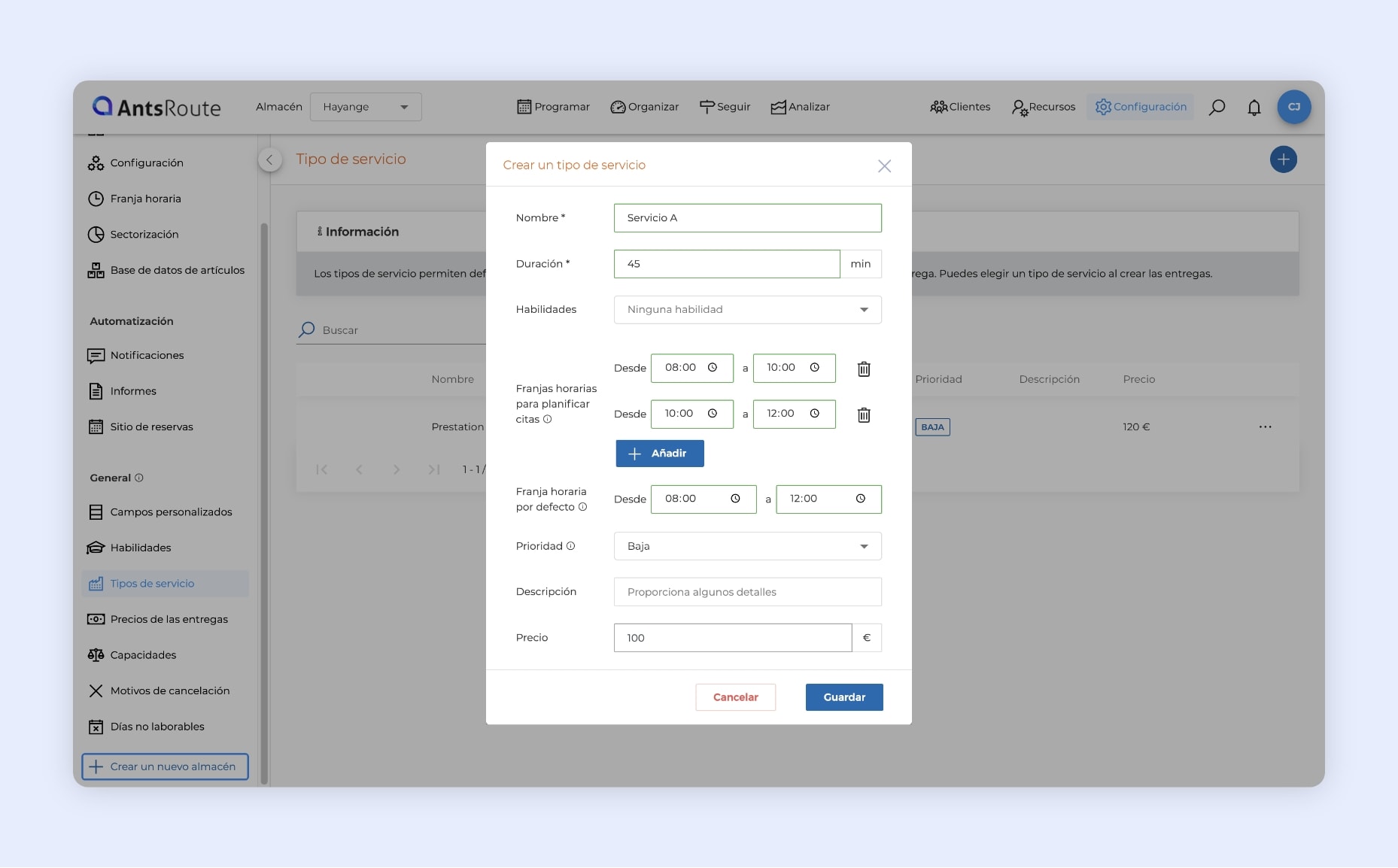 La adición de un tipo de servicio con múltiples franjas horarias en AntsRoute.
