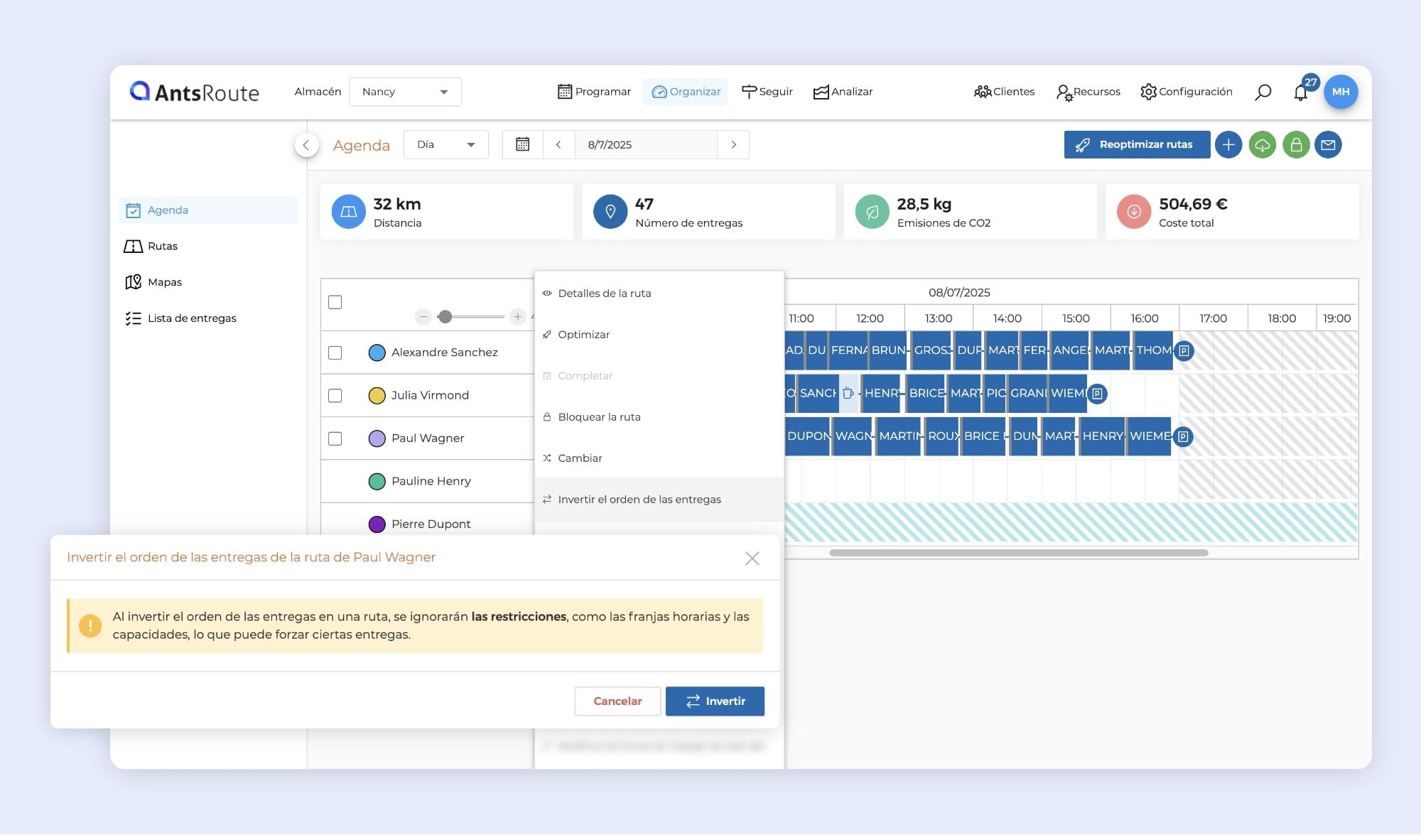 ¡Lo habías pedido y ya está disponible! AntsRoute permite invertir el orden de las intervenciones planificadas en una ruta, directamente desde el módulo «Organizar».
