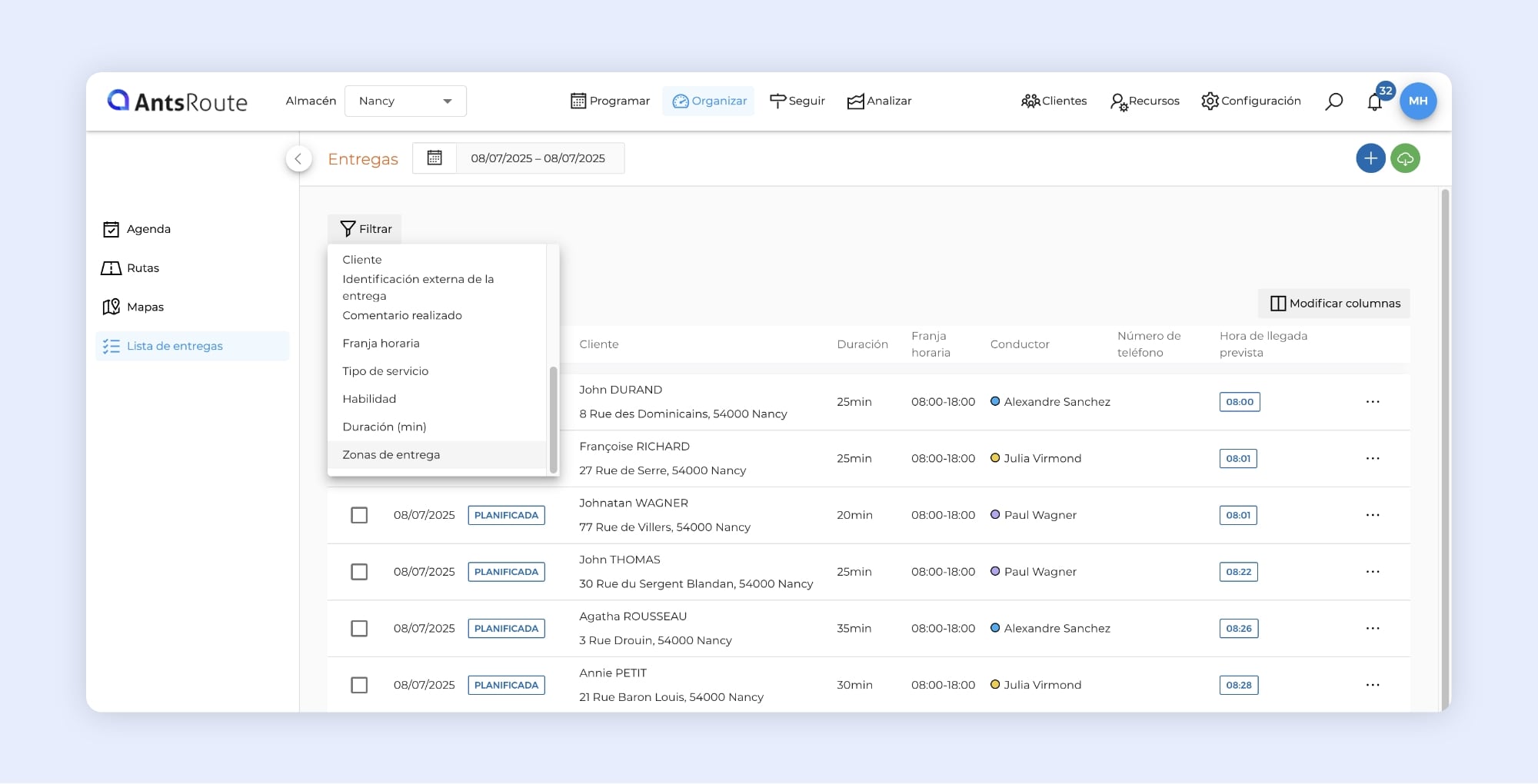 Utilizar un filtro por zona de entrega en la tabla de entregas de AntsRoute.