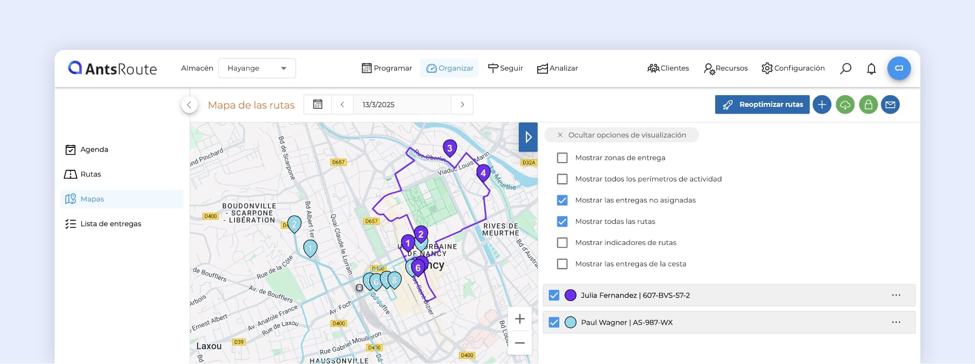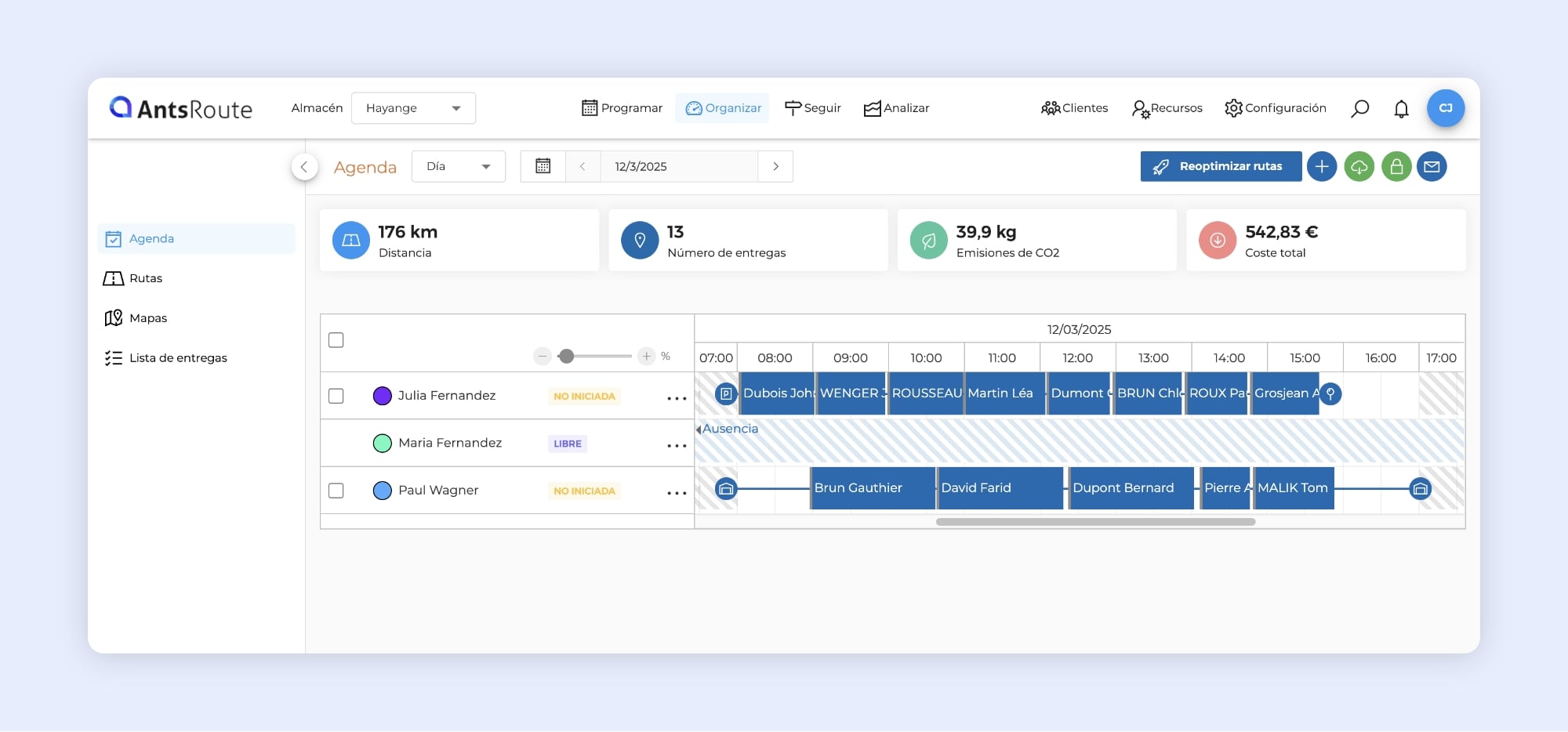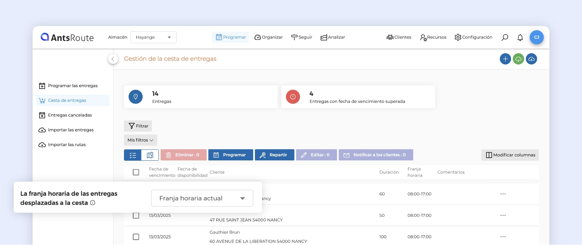 Si aún no la utiliza, esta función le permite añadir a AntsRoute todas sus órdenes de trabajo con fecha de vencimiento y repartirlas de forma inteligente a lo largo de un periodo definido. AntsRoute optimiza automáticamente su asignación, teniendo en cuenta sus limitaciones de tiempo y de negocio, ahorrándole un tiempo precioso a diario.