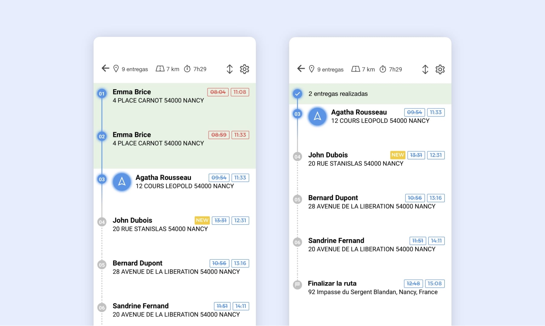 Para tener una visión más clara de su ruta, las tareas completadas se agrupan en una única sección titulada «Entregas realizadas». Basta con hacer clic en el icono ↕️ situado en la parte superior derecha de la lista de tareas para: