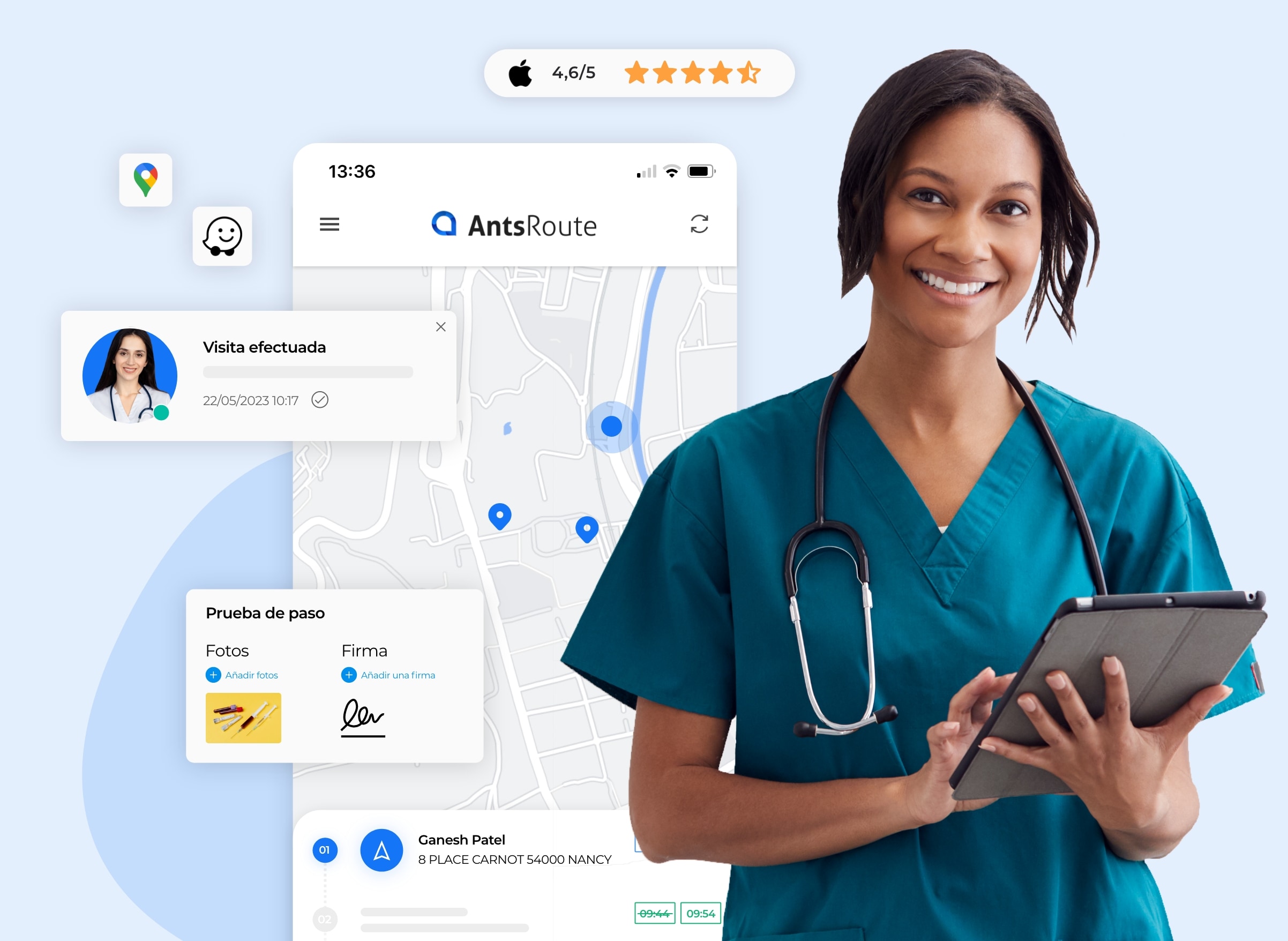 La aplicación móvil AntsRoute integra las herramientas de navegación Waze y Google Maps. Gracias a las herramientas GPS, tu cuidador visualiza el itinerario que tiene que seguir para dirigirse hasta la dirección de la próxima cita.