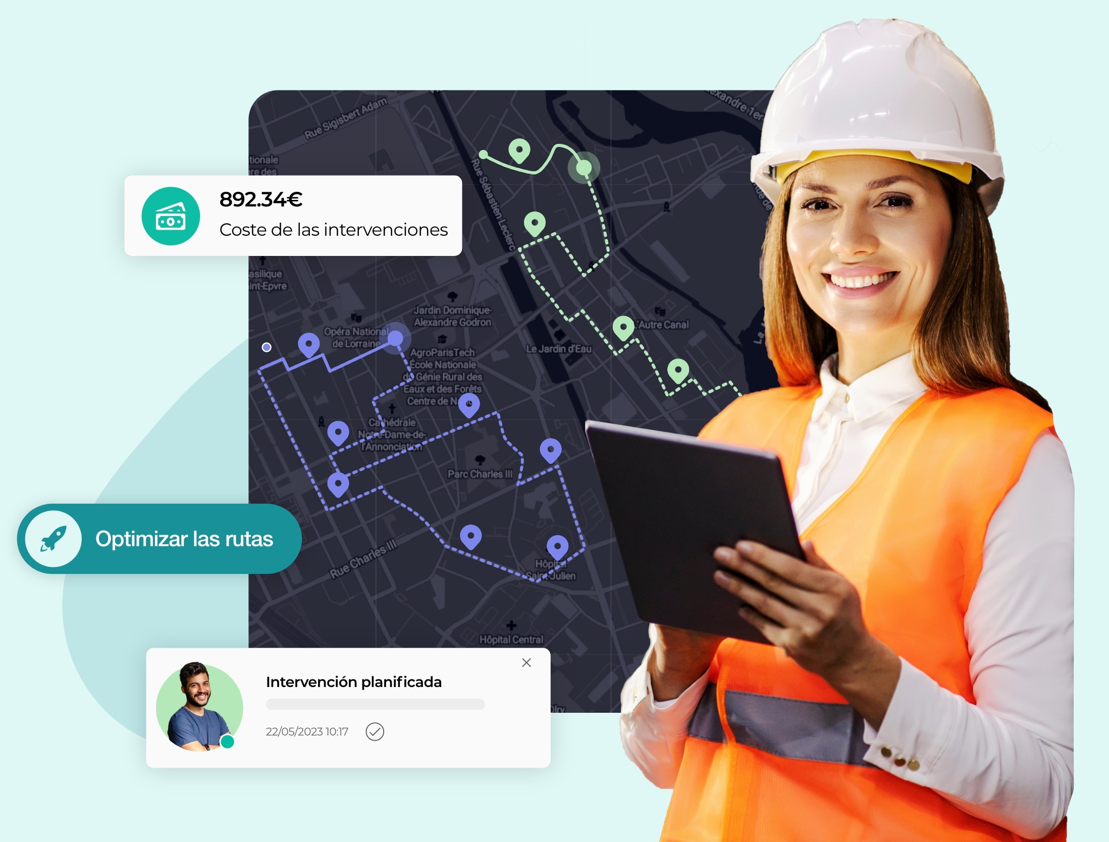 Asignación óptima de la intervención: La herramienta clasifica las rutas a priorizar para reducir el número de desplazamientos y el coste de la etapa. El nuevo lugar de intervención se integra en la ruta del técnico seleccionado.