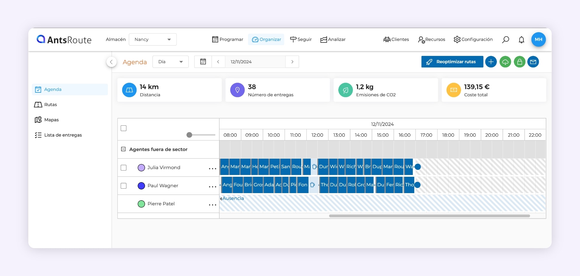 Gracias a la cartografía y los algoritmos automatizados de AntsRoute, la planificación de rutas es prácticamente instantánea. El software optimiza las rutas y distribuye las entregas teniendo en cuenta el peso de las mercancías, los vehículos disponibles y las zonas de entrega.