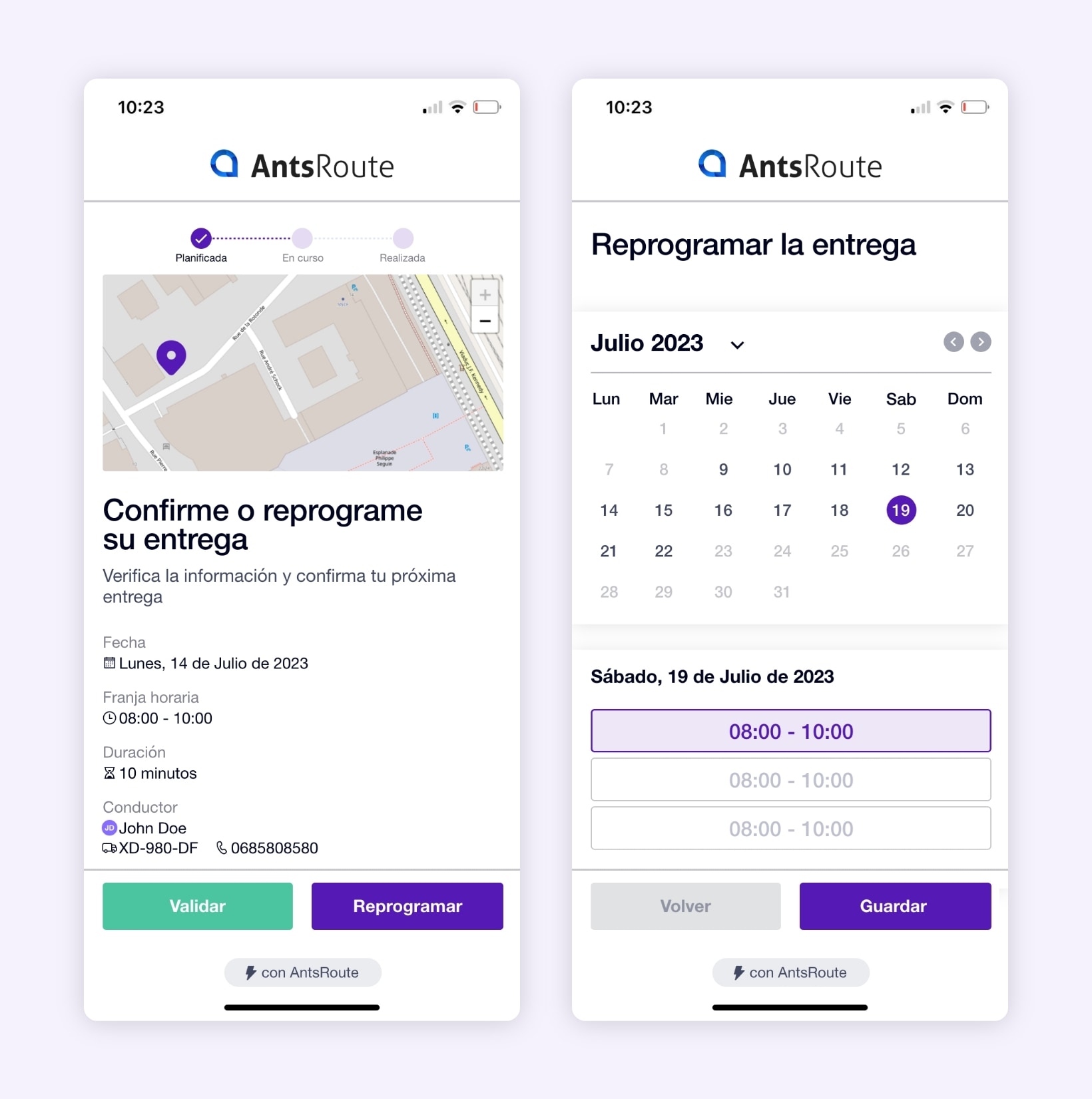 Envío de un enlace a través de AntsRoute para reprogramar una entrega.