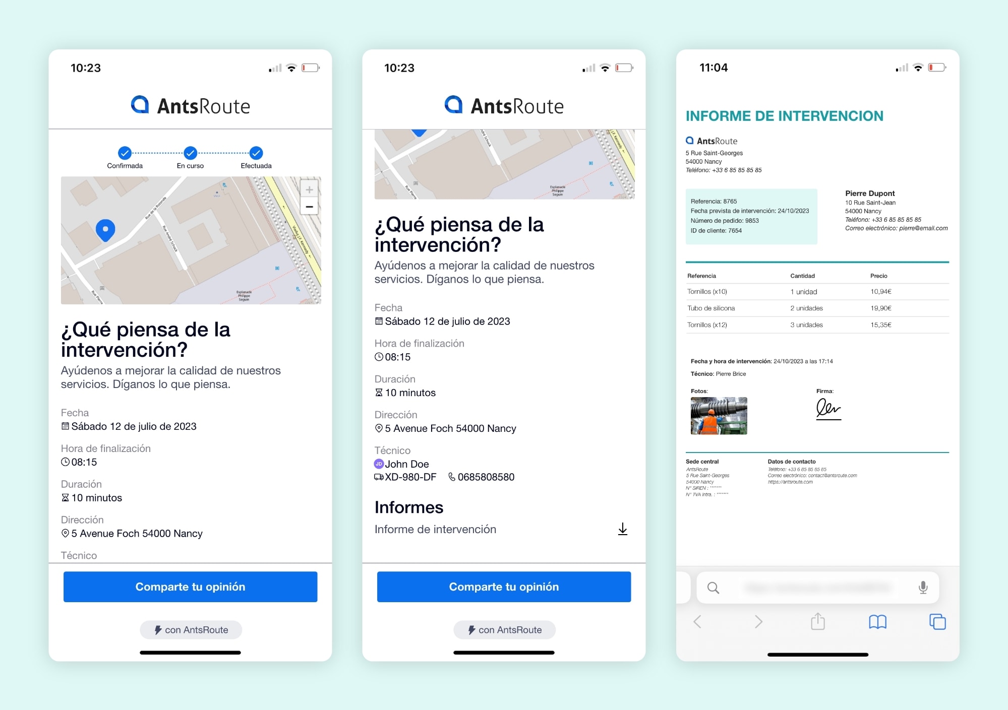 Un informe de intervención generado en AntsRoute y enviado al cliente.