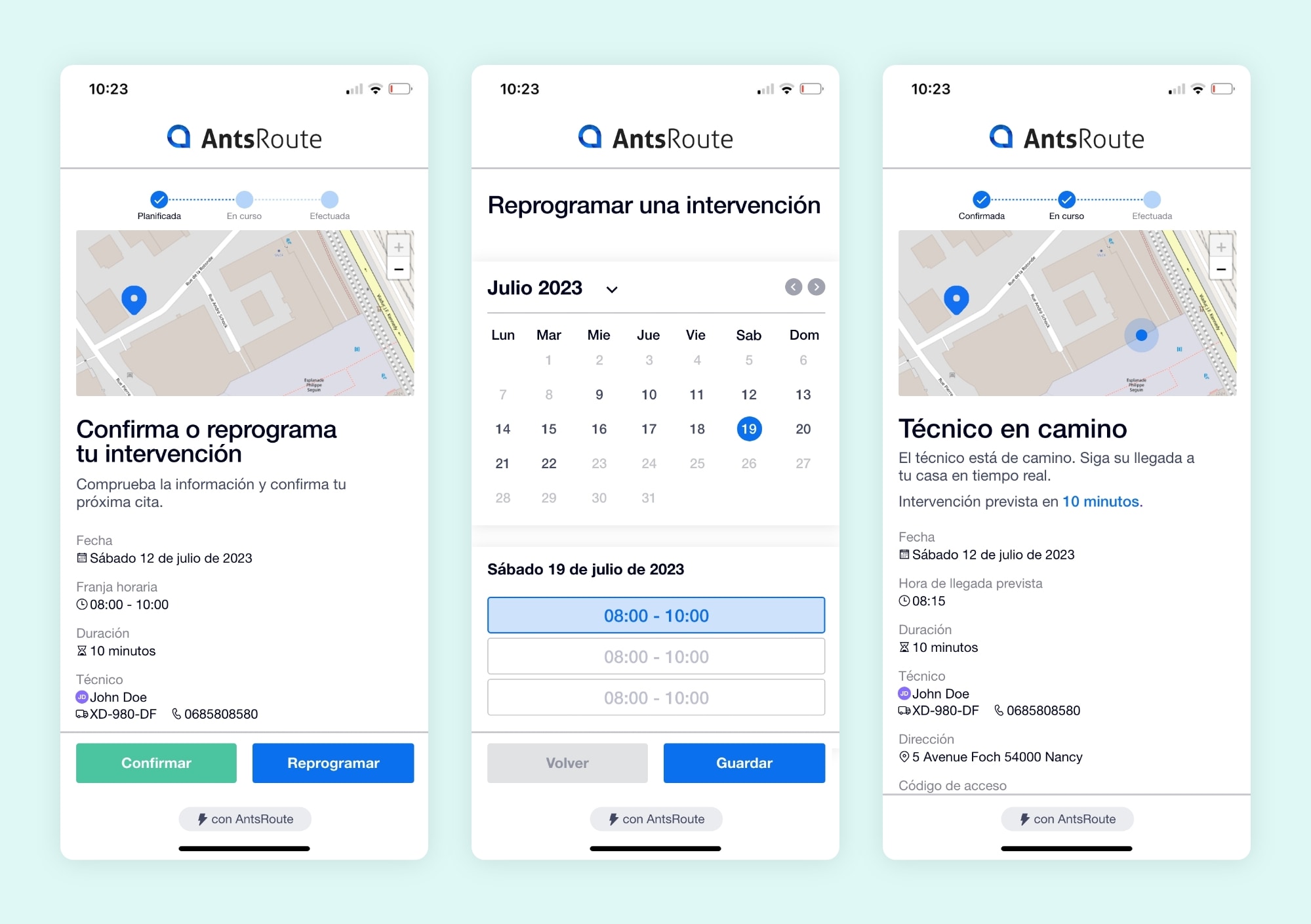 - Un sistema de envío de notificaciones por email o SMS permite confirmar la fecha y la hora de paso del técnico con el cliente. Por ejemplo, se puede mandar un enlace que permite al cliente confirmar o reprogramar la cita. En caso de imprevisto, el cliente puede pinchar este enlace para elegir una nueva franja horaria de paso.