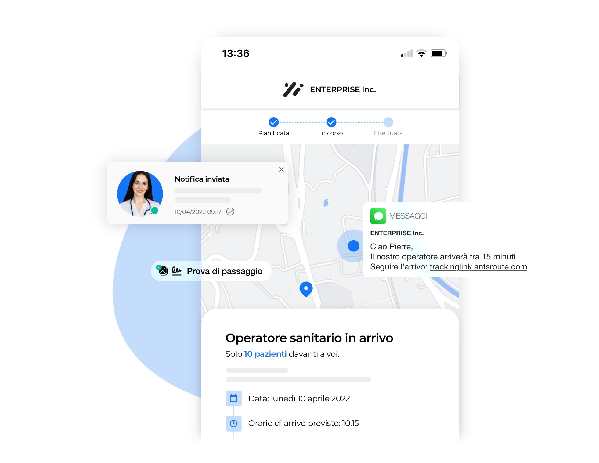 Per evitare gli appuntamenti mancati, AntsRoute propone un sistema di invio di notifiche tramite SMS o email con messaggi di testo personalizzati. L’invio di informazioni a ogni tappa rassicura il paziente e gli consente di organizzarsi facilmente fino all’arrivo del personale sanitario: