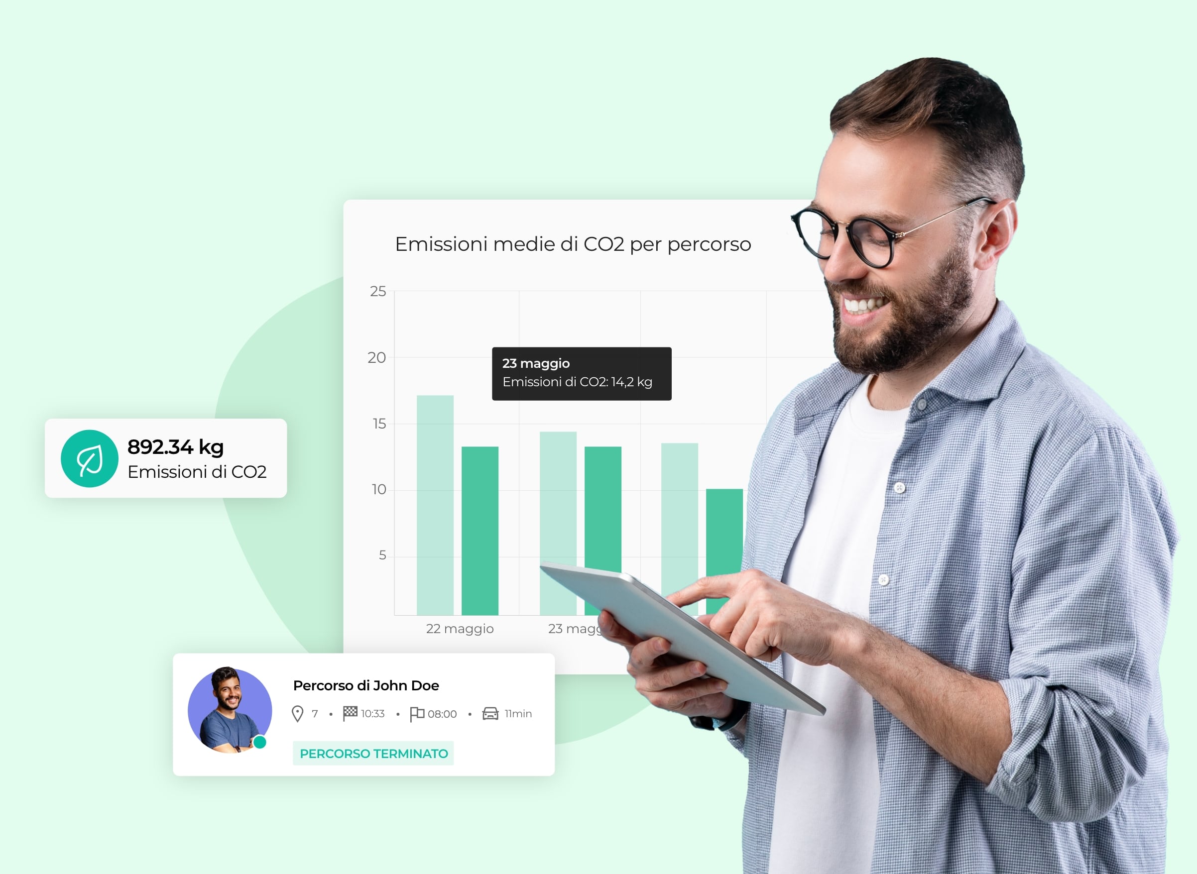 Segui le quantità di CO2 emesse per intervento, conducente o giro. L’analisi di questi dati ti consente di misurare i risparmi di CO2 che realizzi con AntsRoute.