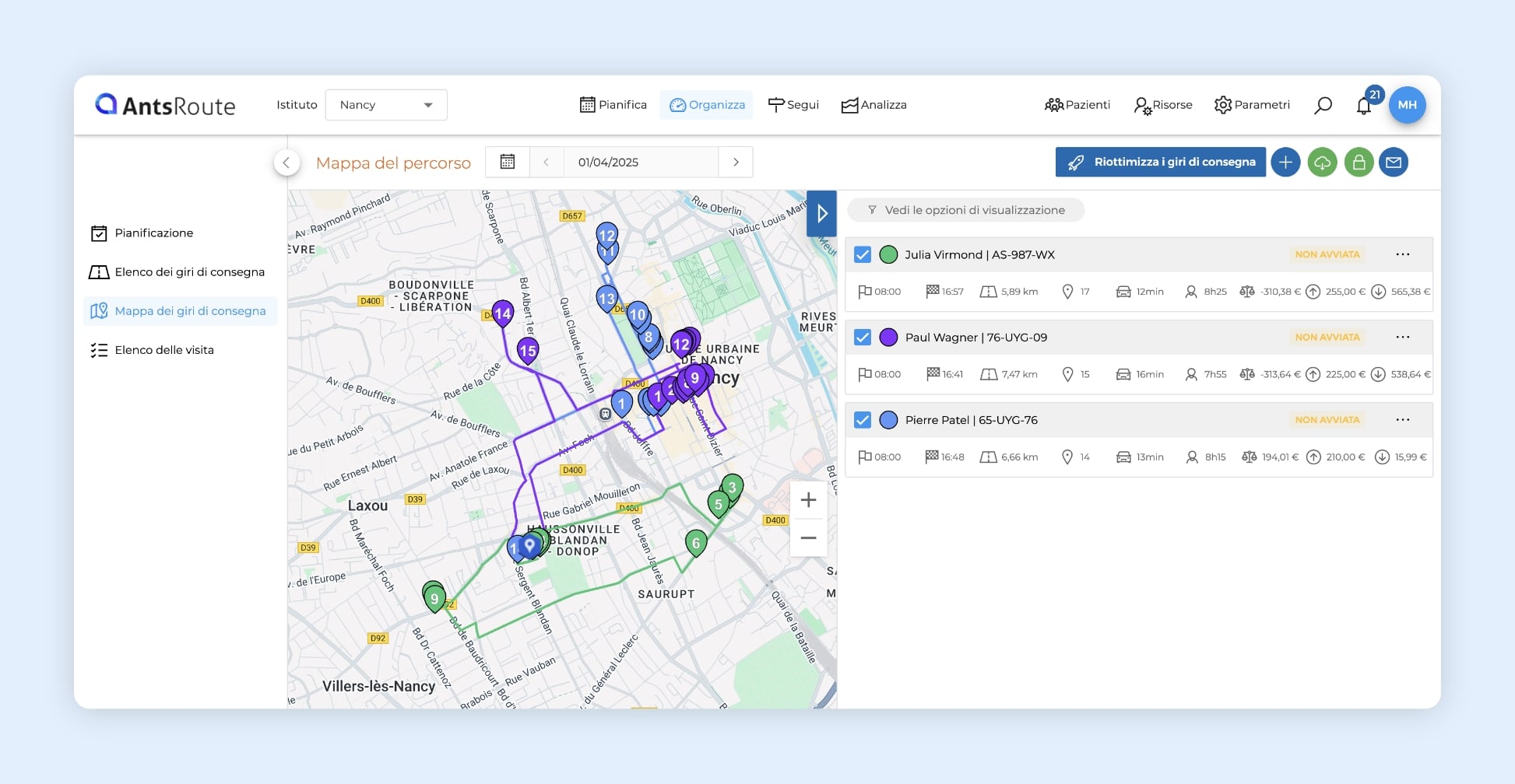 Piattaforme come AntsRoute permettono di pianificare i percorsi in modo intelligente, tenendo conto di variabili fondamentali: posizione dei pazienti, fasce orarie preferite, durata stimata degli interventi, competenze richieste, livello d’urgenza, ecc. I tragitti vengono ottimizzati, gli spostamenti ridotti e il carico di lavoro distribuito in modo più equilibrato.