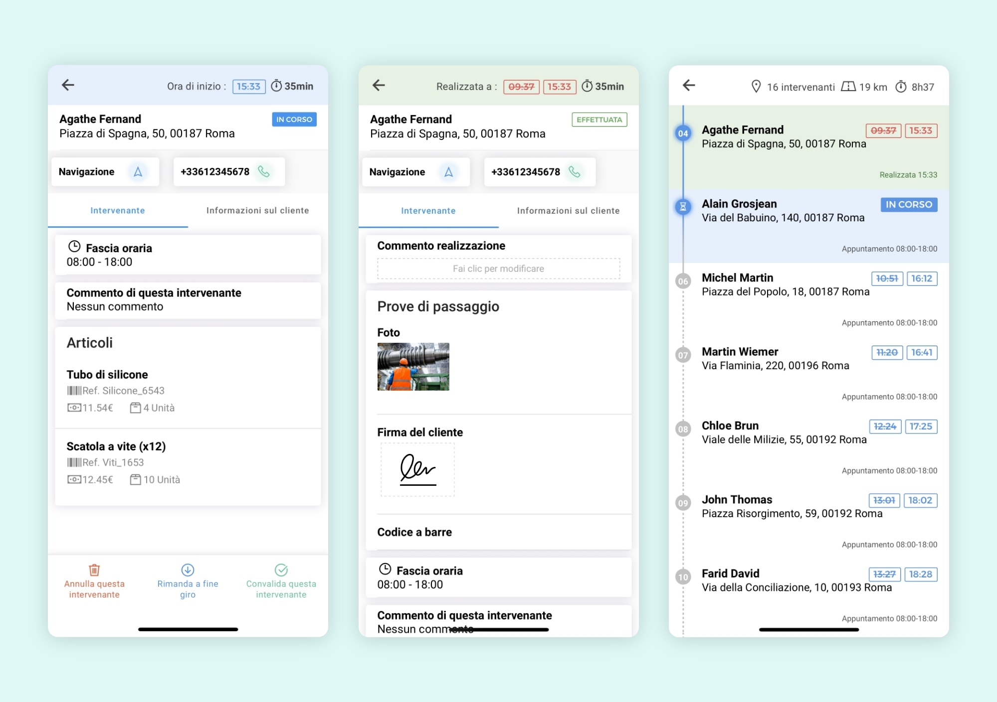 Ogni agente itinerante può visualizzare la propria pianificazione aggiornata in tempo reale, corredata da tutte le informazioni per intervenire efficacemente: