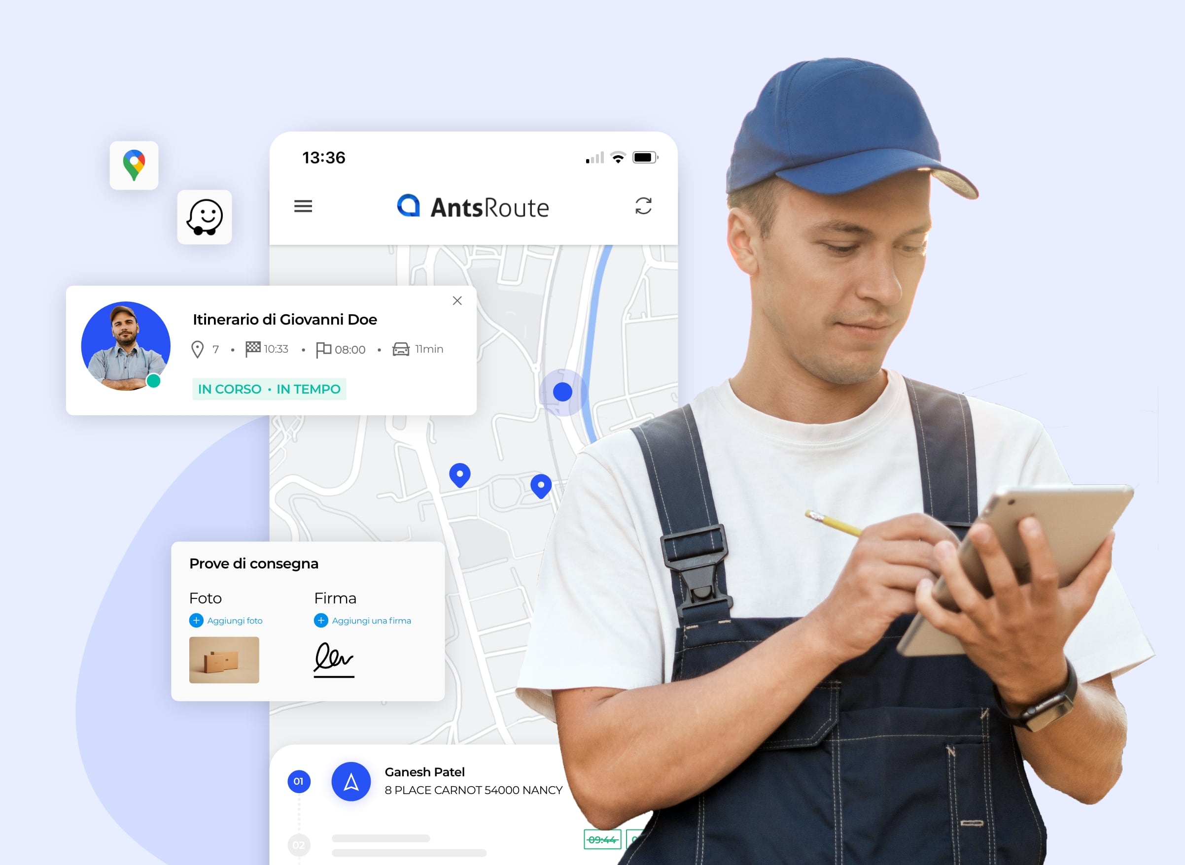 Grazie all’applicazione mobile AntsRoute, i tuoi team possono inoltre avviare con molta semplicità la navigazione GPS verso la tappa successiva.
