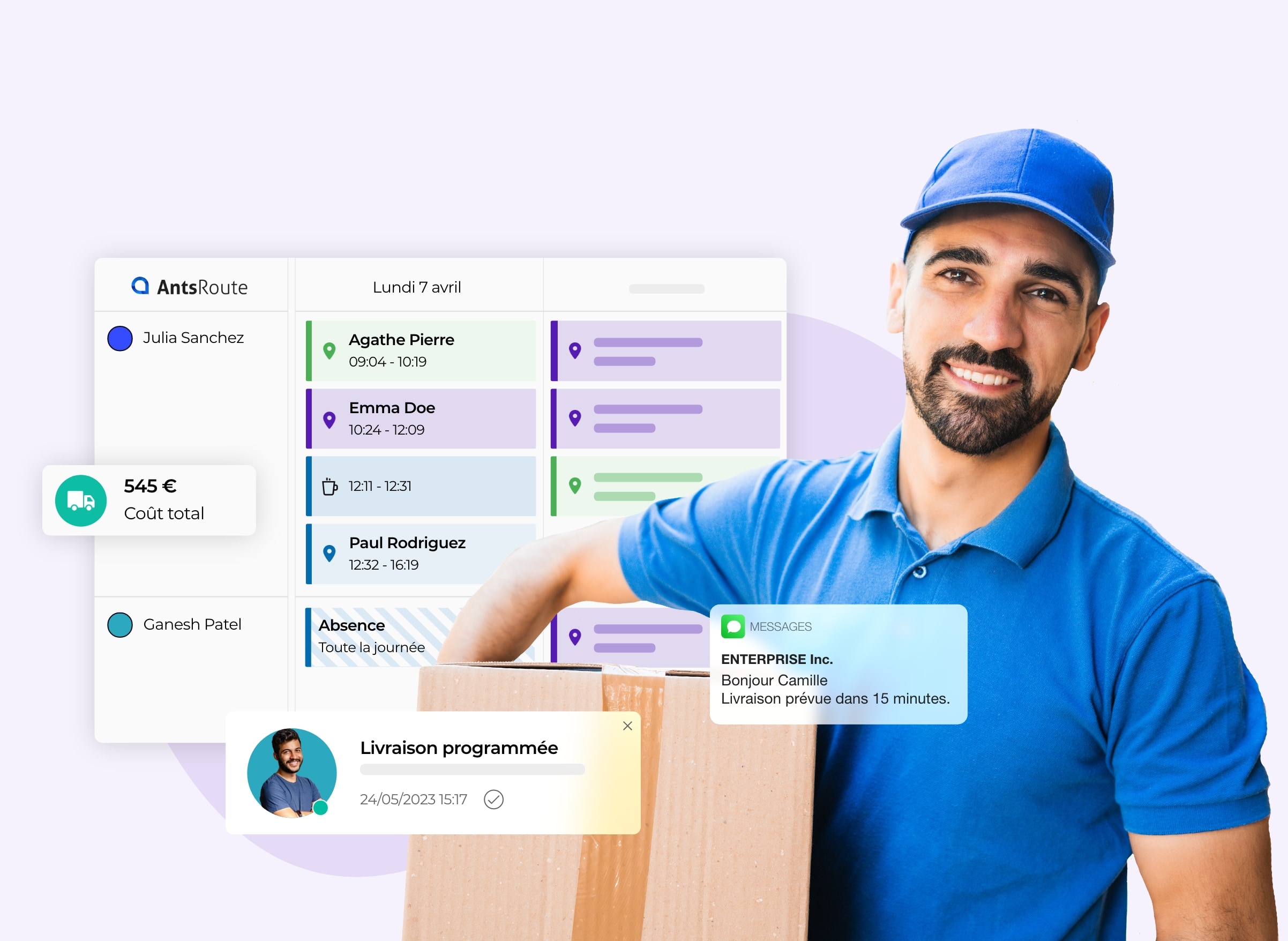 L’application mobile AntsRoute permet à vos chauffeurs-livreurs de récupérer les étapes de leurs tournées et d’échanger avec le responsable d’exploitation et vos clients en toute simplicité. Vous renforcez l’autonomie de vos livreurs et vous gardez une maîtrise complète de votre activité sur le terrain.