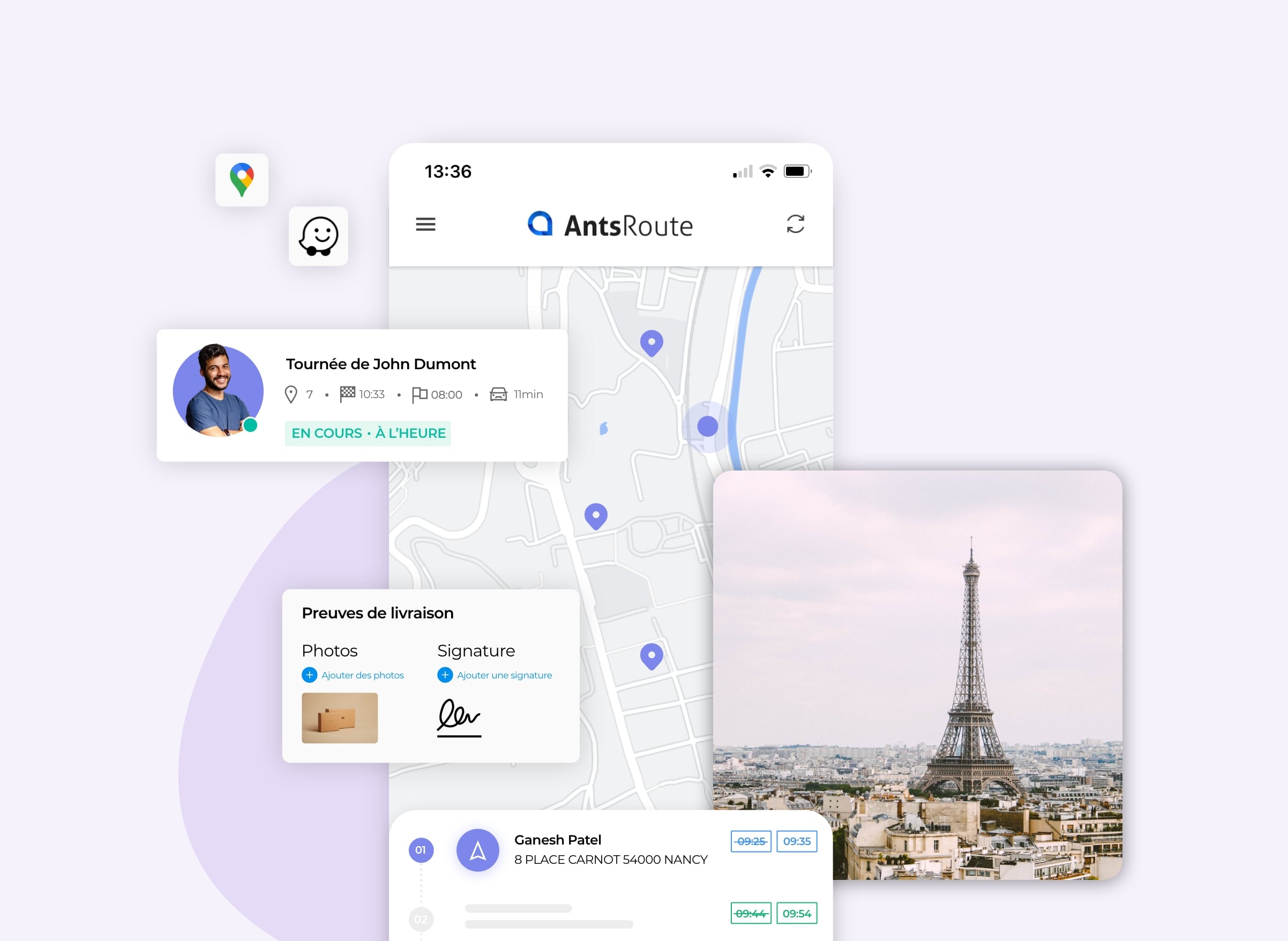 AntsRoute embarque automatiquement votre logiciel de navigation préféré, Waze ou Google Maps. Une solution 2 en 1 idéale pour gérer au mieux les imprévus qui jalonnent vos tournées :
