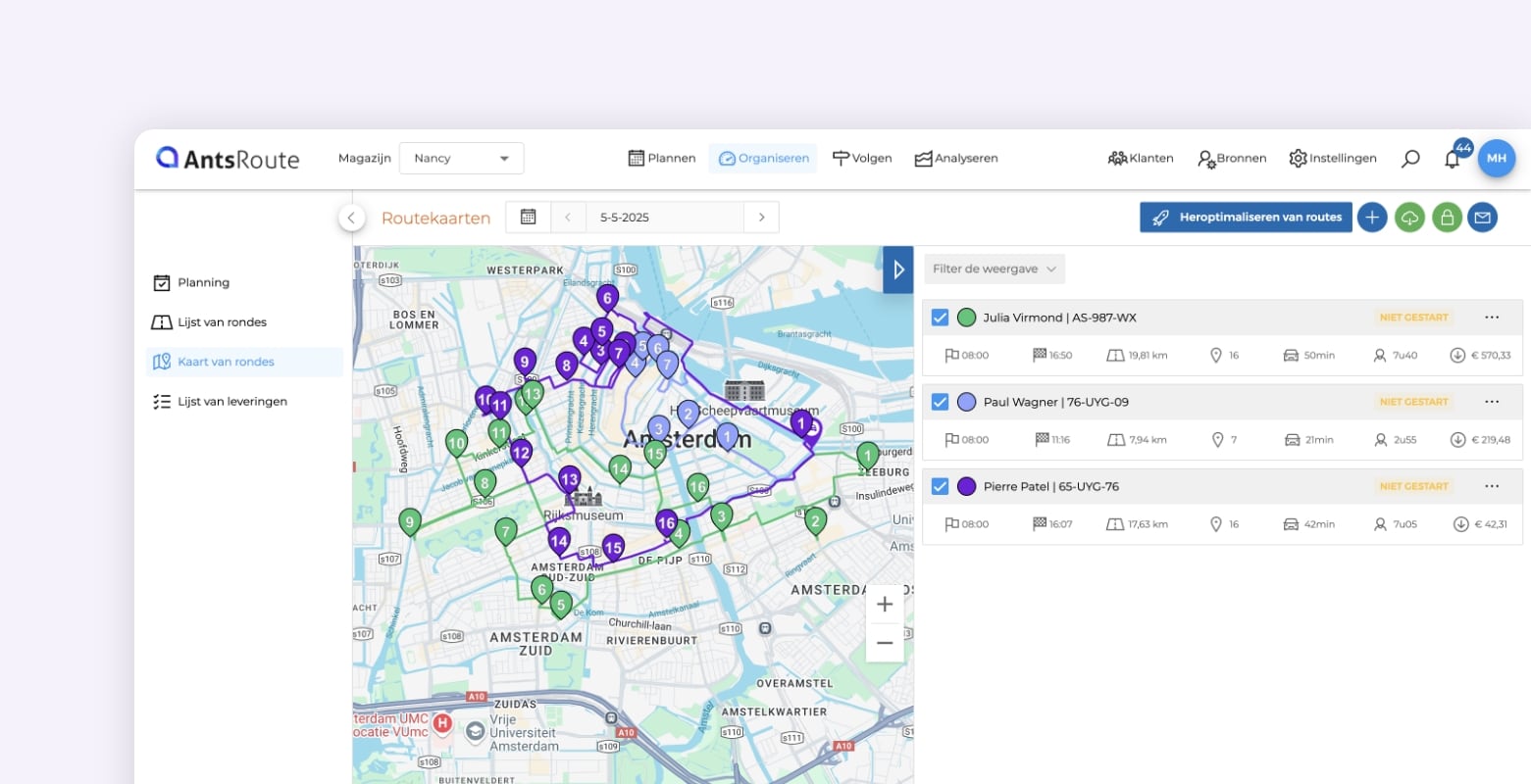 De software-interface van AntsRoute voor routeoptimalisatie.