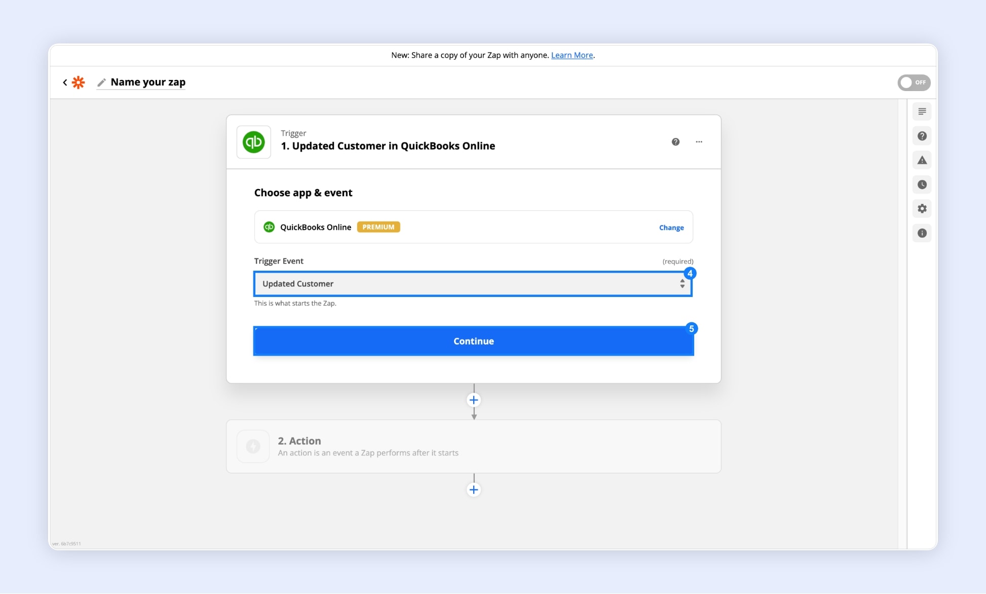 - Pour commencer, connectez votre compte Quickbooks à Zapier et choisissez le trigger « New Customer ». Et n’oubliez pas… Si vous êtes nouveau sur Quickbooks, vous devez ajouter au préalable au moins un premier client avant de tester votre trigger.