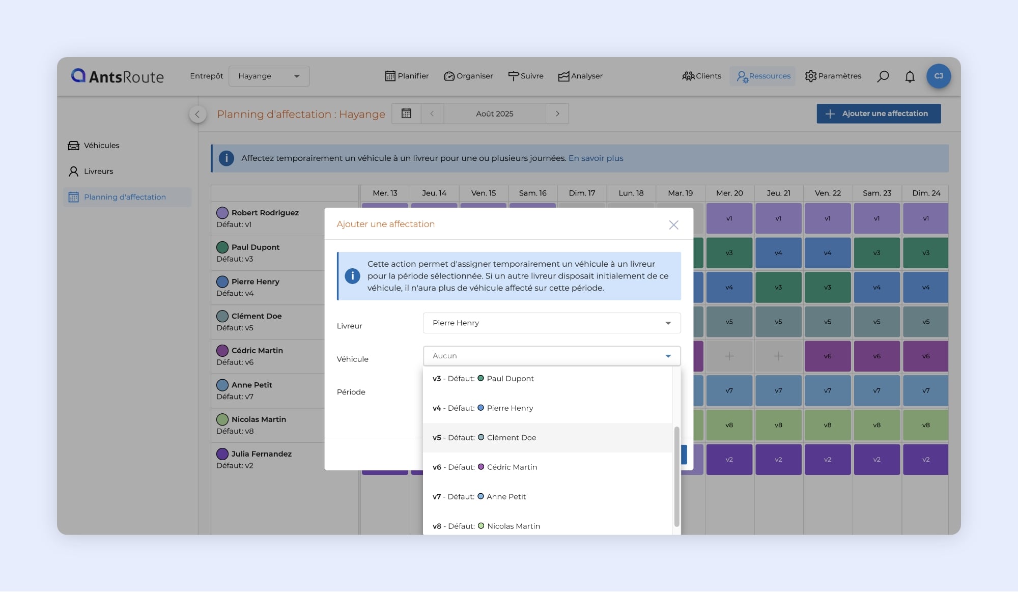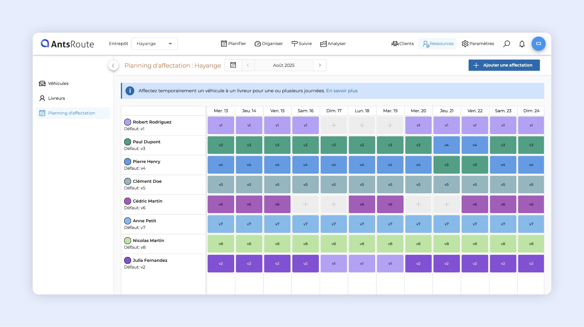 Le planning d’affectation des véhicules sur AntsRoute.