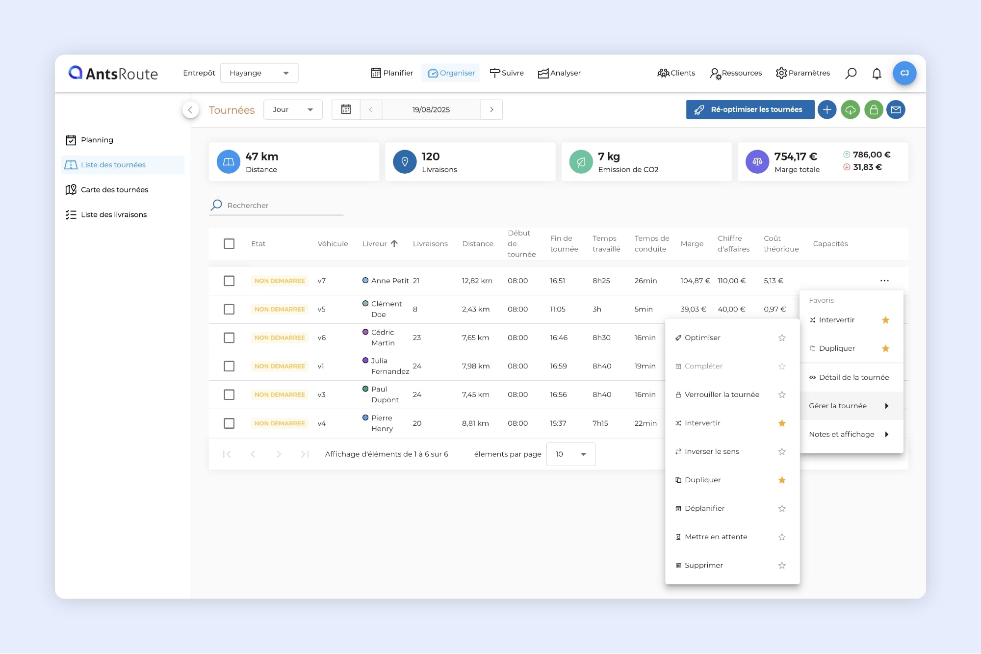 • Nouveau menu d’action sur les tournées