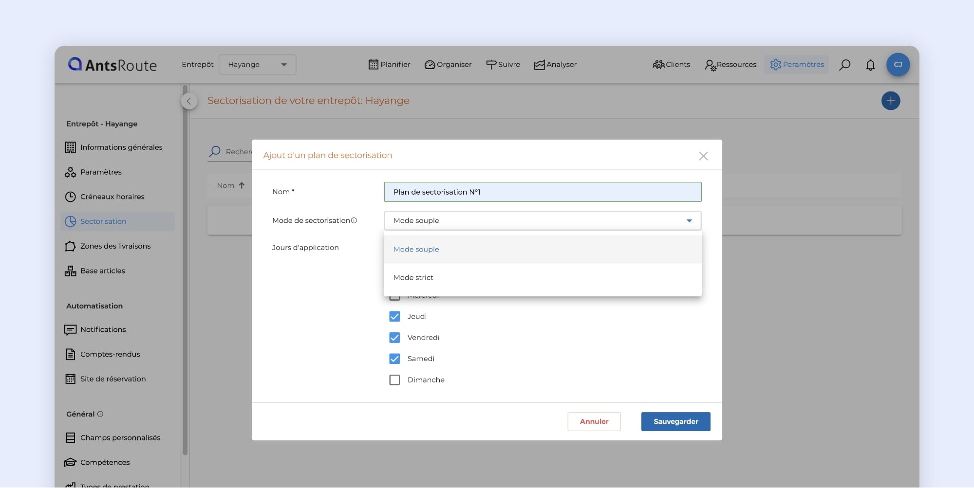 - Si ce n’est pas encore fait, rendez-vous dans les paramètres de votre compte AntsRoute et activez la fonction de sectorisation.