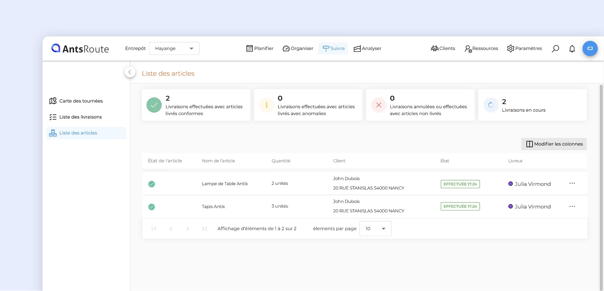 Vous pouvez ainsi consulter en un clin d’œil des informations détaillées sur vos articles : état de l’article, nom de l’article, quantité, client, état de la livraison, et livreur assigné. Un outil parfait qui permet d’avoir une vision complète et précise de vos articles et livraisons, tout en facilitant le suivi des anomalies.