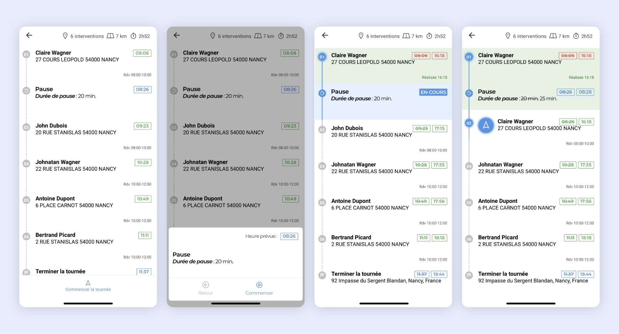 - Affichage des pauses dans les tournées en cours et sur l’application mobile