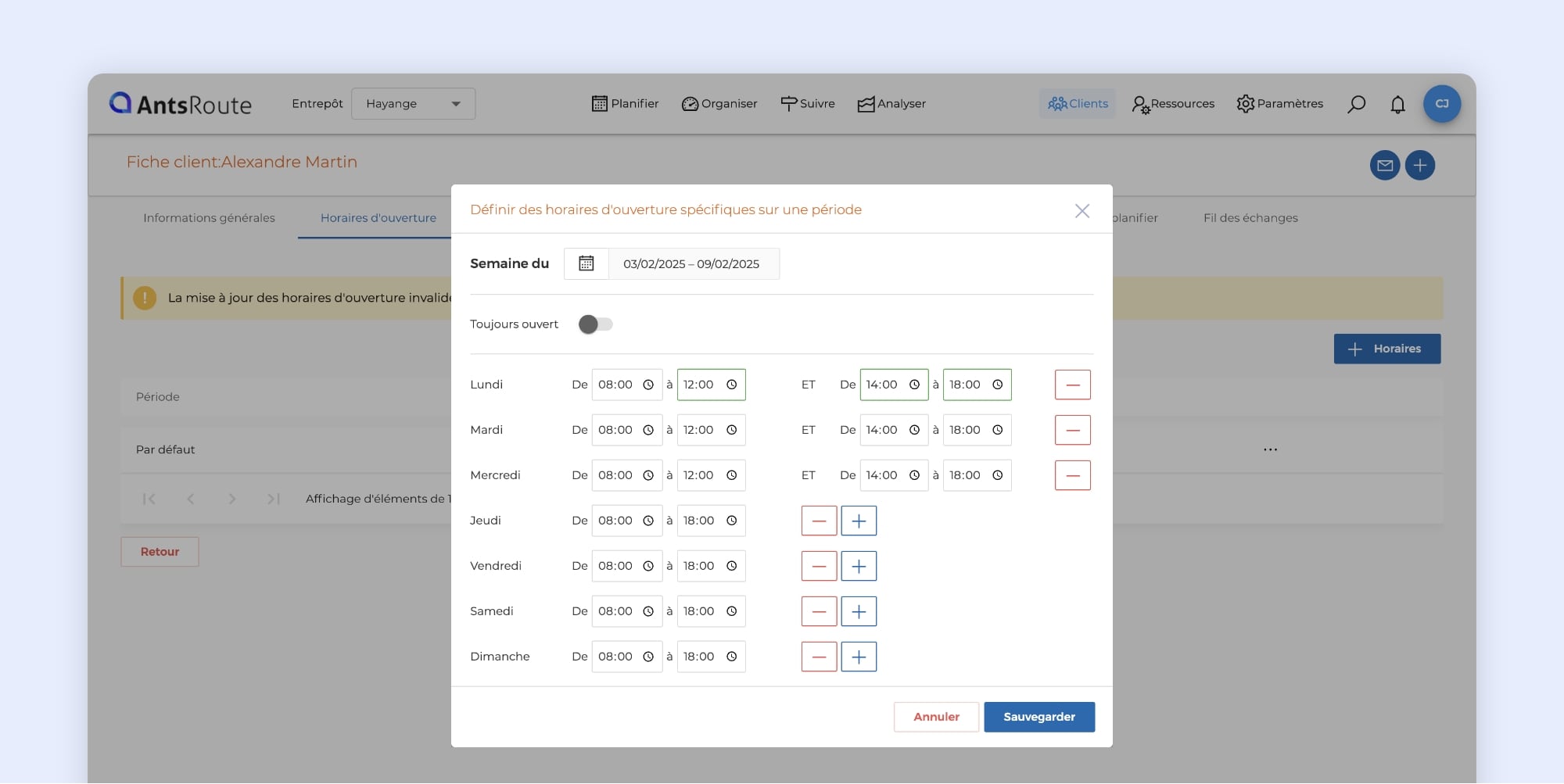 La configuration des horaires d’ouverture d’un client sur AntsRoute.
