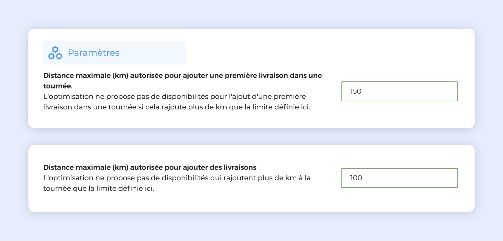 Dans les paramètres de votre compte, vous pouvez désormais définir une distance maximale autorisée en kilomètres pour ajouter des interventions à une tournée existante. Cette option se décline en deux paramètres distincts :