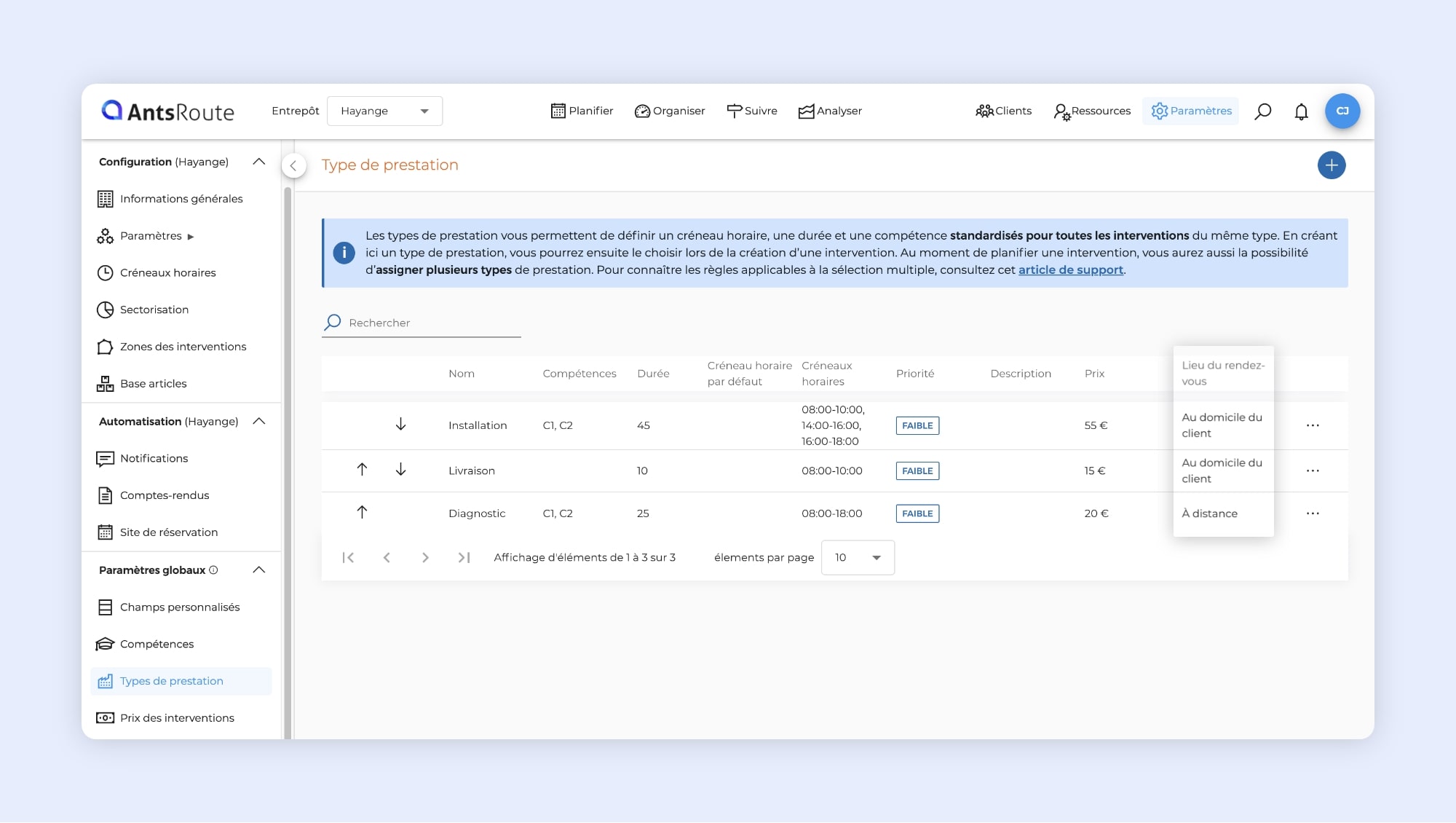 AntsRoute vous permet désormais d’aller plus loin dans la personnalisation de vos créneaux horaires. Grâce à la fonctionnalité Types de prestation, vous pouvez configurer jusqu’à 12 créneaux horaires différents pour un même type de prestation, contre 4 auparavant.