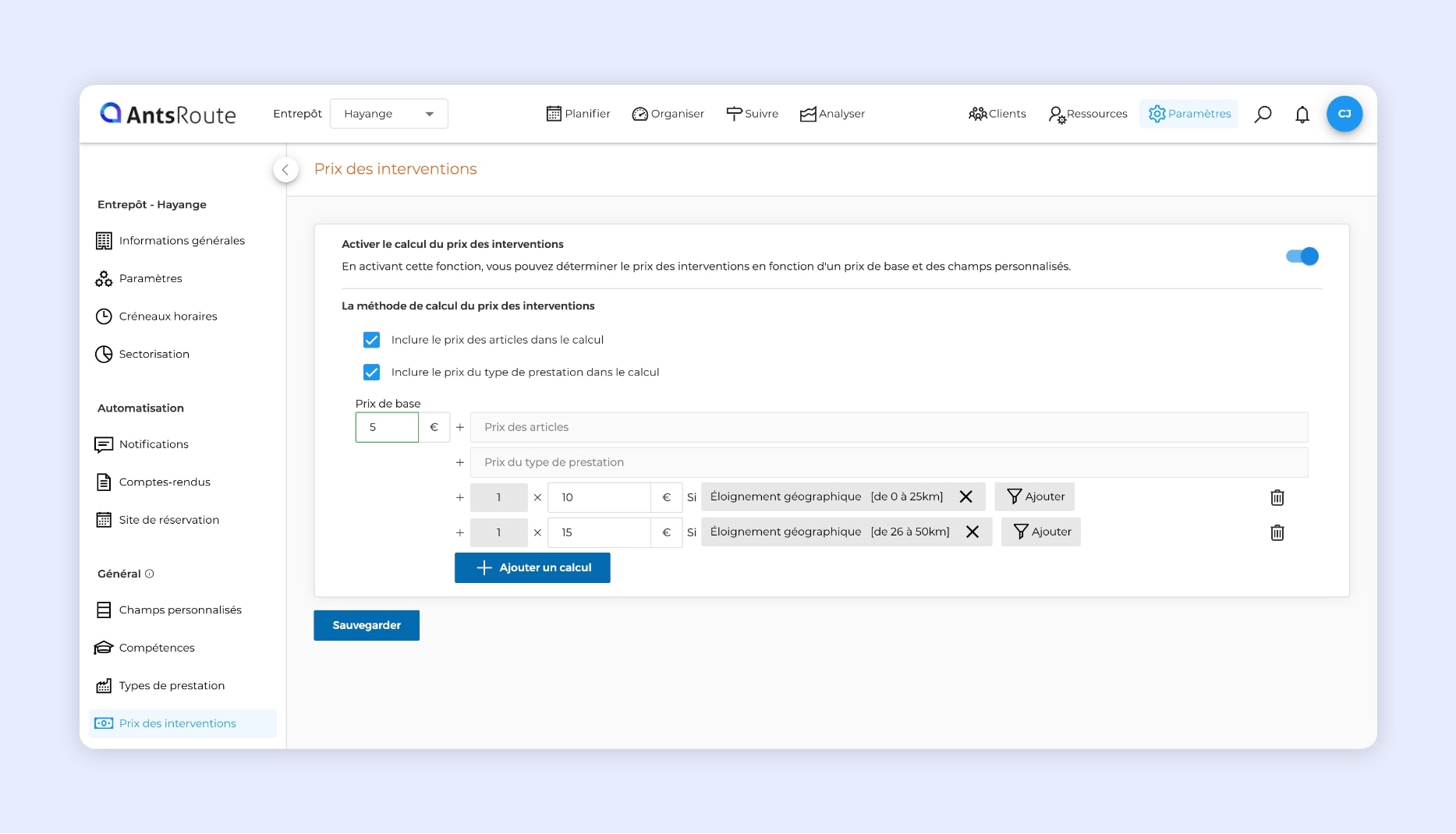 La création d’une règle de calcul du prix des interventions sur AntsRoute.