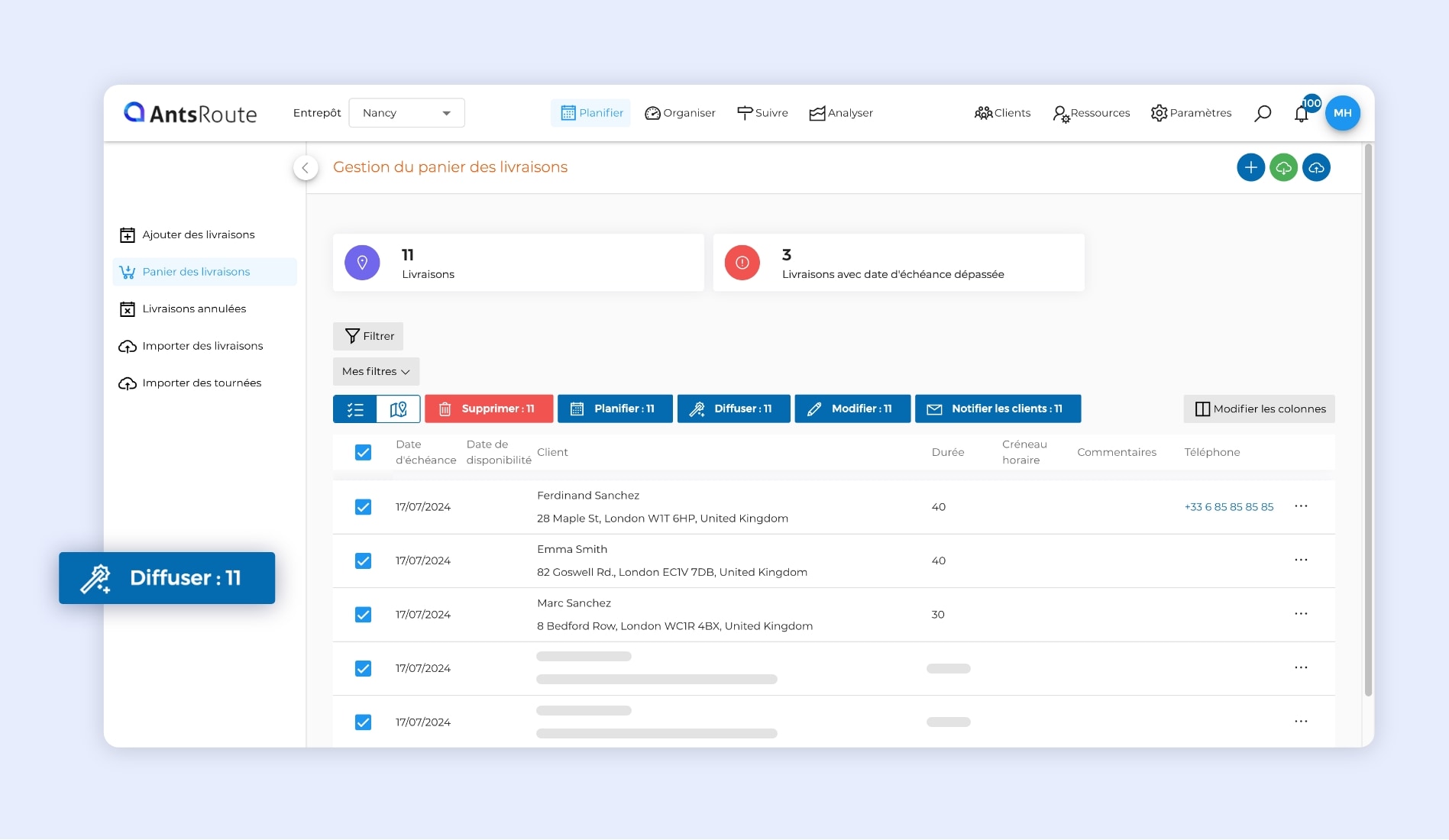 Note : Pour bénéficier de cette fonction de diffusion, vous devez planifier vos rendez-vous depuis l’onglet « Panier des interventions ». Pour rappel, cet onglet permet de planifier des rendez-vous qui n’ont pas de date fixe, mais simplement une date d’échéance, c’est-à-dire une date limite avant laquelle l’intervention ou la livraison doit être réalisée.