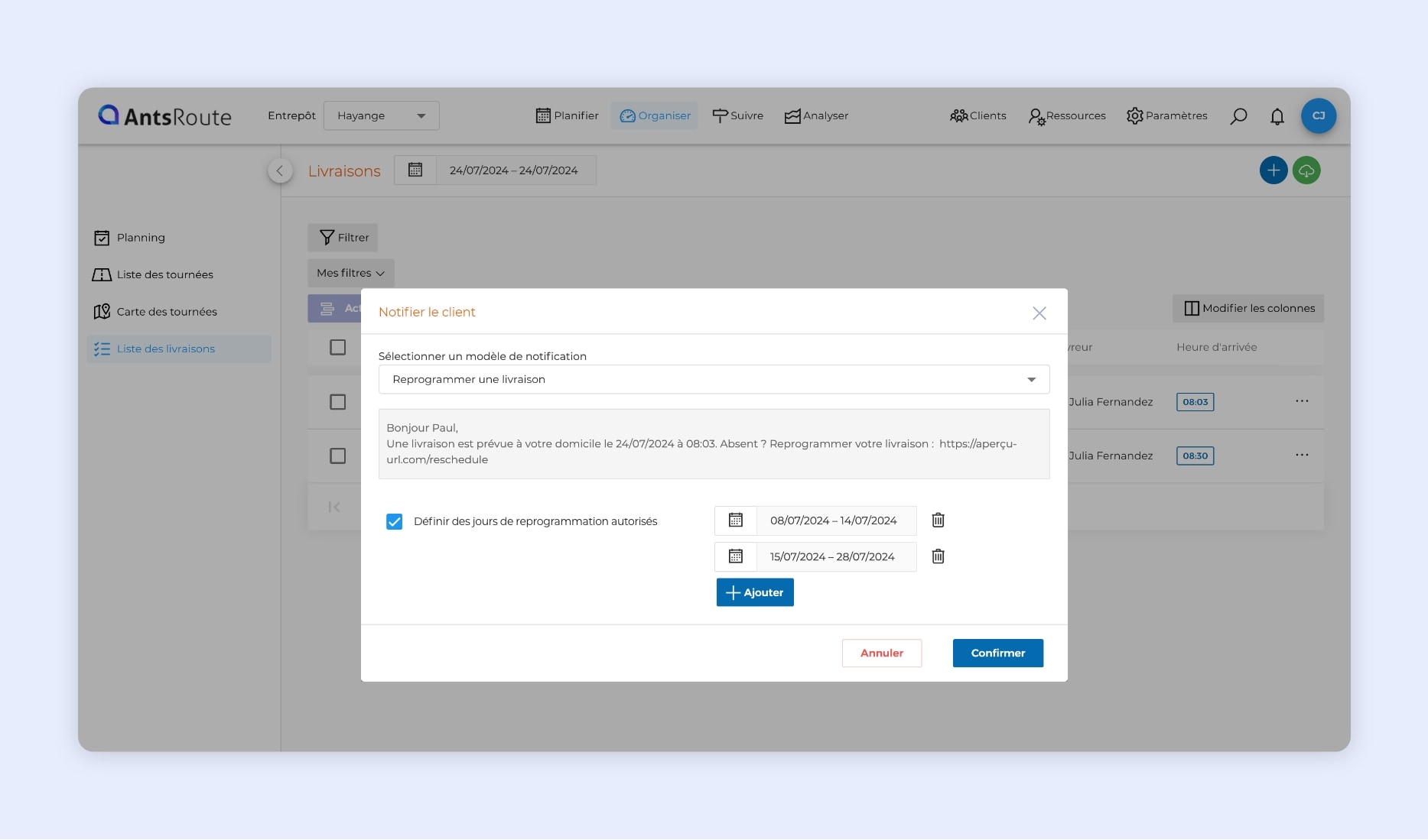 Prenons l’exemple de l’envoi d’un modèle de notification avec un lien de reprogrammation depuis l’onglet « Planning » du module « Organiser ». Au moment de notifier vos clients, vous pouvez cocher l’option « Définir des jours de reprogrammation autorisés ». Vous pouvez ajouter autant de jours et/ou de périodes de reprogrammation autorisés que nécessaire.