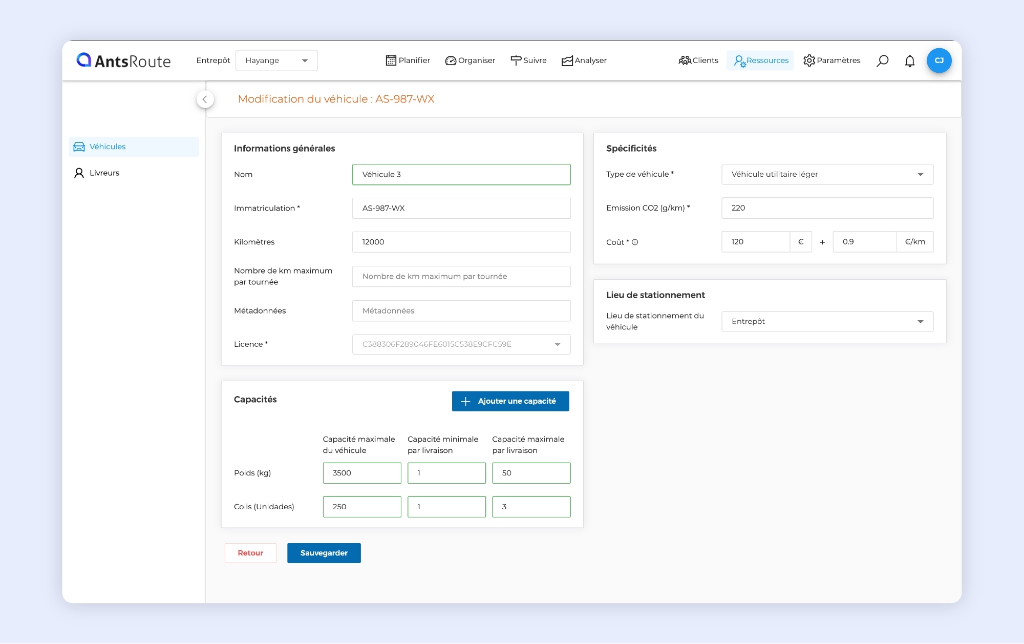 La gestion des capacités des véhicules sur AntsRoute.